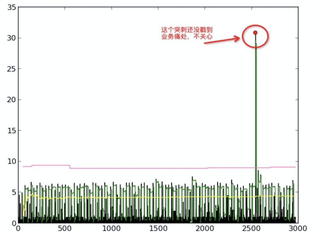 基础阈值曲线(如下图中的黄色曲线)反映的是真实 IO 指标数据的波动情况,但是 IO 指标在平稳状态下往往是限于一个范围内波动,所以需要计算一个补偿阈值,叠加到基础阈值上会减缓基础阈值的快速下降,而从而减少带来误报的情况。