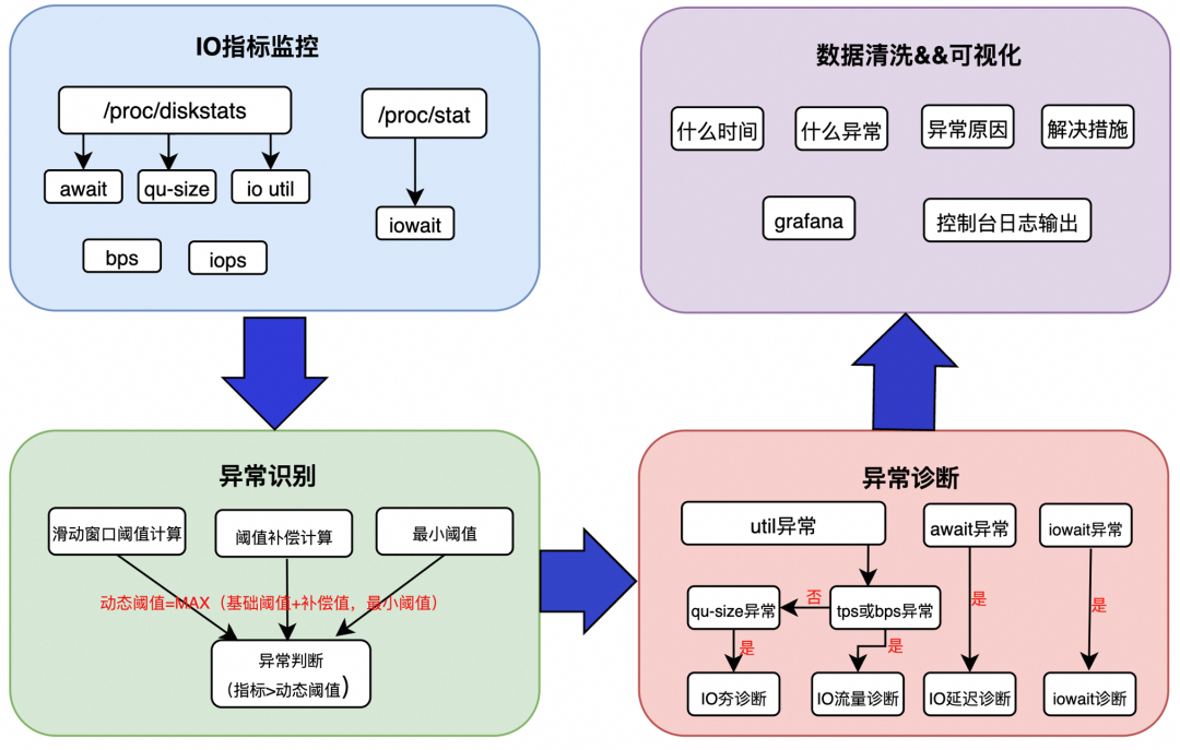 由于不同的业务场景,关注的指标阈值会不一样,如果统一一个静态阈值覆盖各种场景,很可能引起异常的误报或者漏报,因此 IO 一键诊断通过动态阈值来识别异常,总体架构图设计如下图所示: