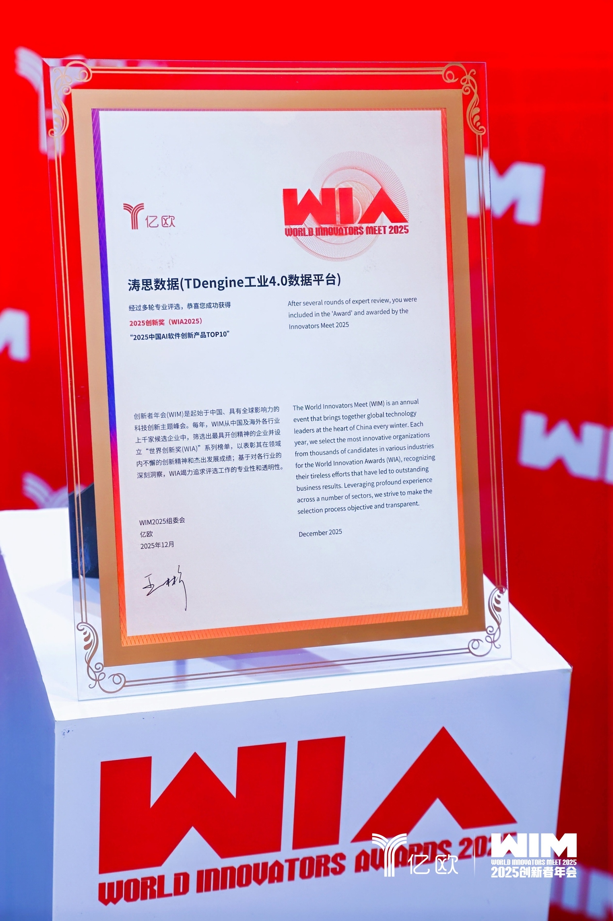 就在近日由亿欧主办的 WIM2025 创新者年会上,这个问题得到了清晰回应。大会发布了“2025 中国 AI 软件创新产品 Top10”评选结果,涛思数据基于 TDengine 工业 4.0 数据平台入选这一年度榜单。对一个长期深耕工业数据基础设施的产品来说,这项认可的意义不在于“AI”,而在于“软件”与“产业”之间的那条真正可落地的路径。