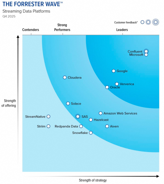 本次报告中,除 Ververica 外,微软、谷歌、甲骨文等国际科技巨头,以及专注流式数据平台的厂商 Confluent 也入选了领导者象限。此次报告反映出流式数据平台市场呈现"巨头与专业厂商并存"的竞争格局,Ververica 作为专注 Apache Flink 生态的专业厂商,其首次入选领导者象限凸显了开源技术在企业级应用中的重要价值。