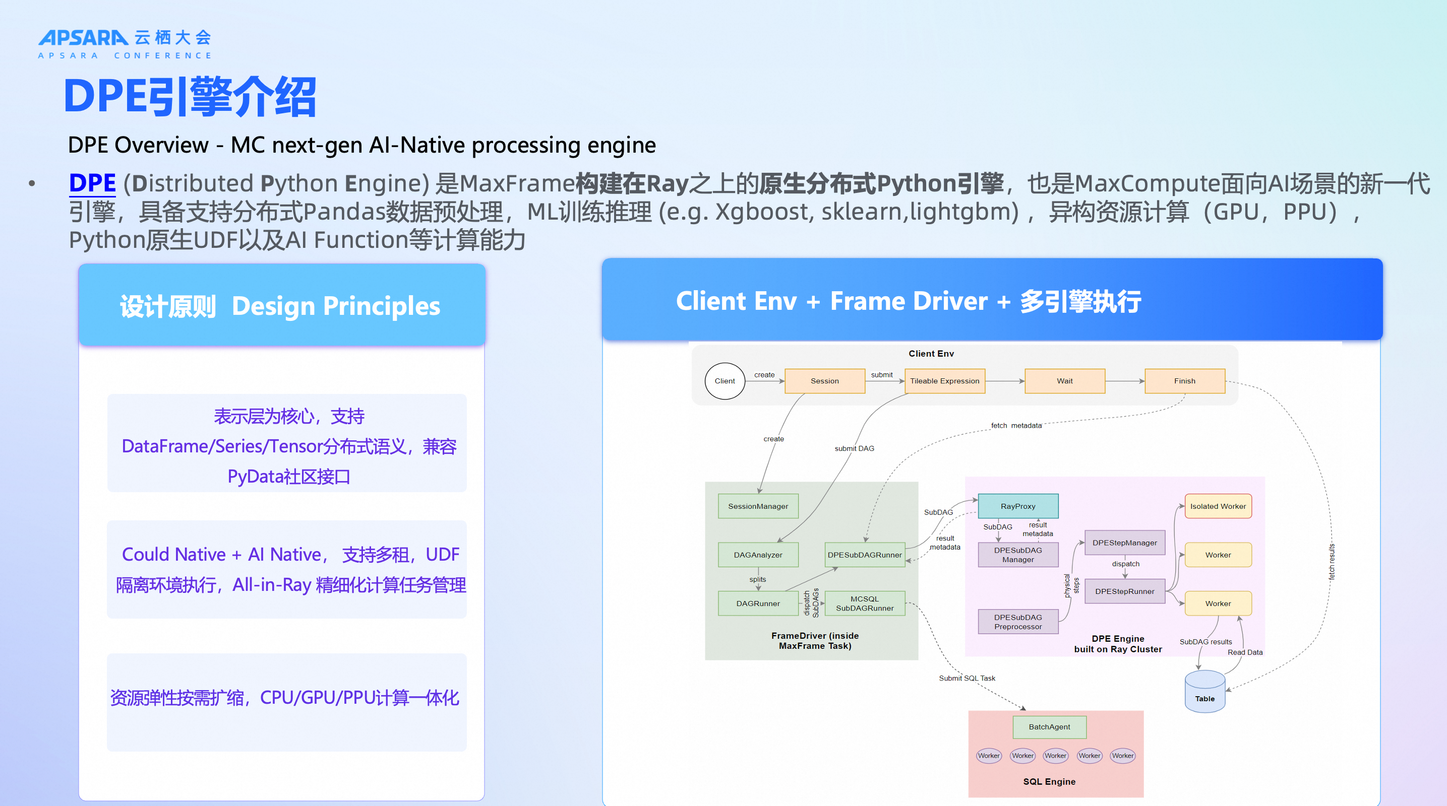 而在 AI 计算层面,新一代分布式 Python 引擎 DPE(Distributed Python Engine)正式上线。该引擎基于 Ray 构建,但在接口层保留了 MaxFrame 对 Pandas 语义的高度兼容,开发者可像编写本地脚本一样开发分布式程序。无论是 XGBoost 模型训练,还是大规模 Pandas 数据清洗,均可在云端无缝运行。
