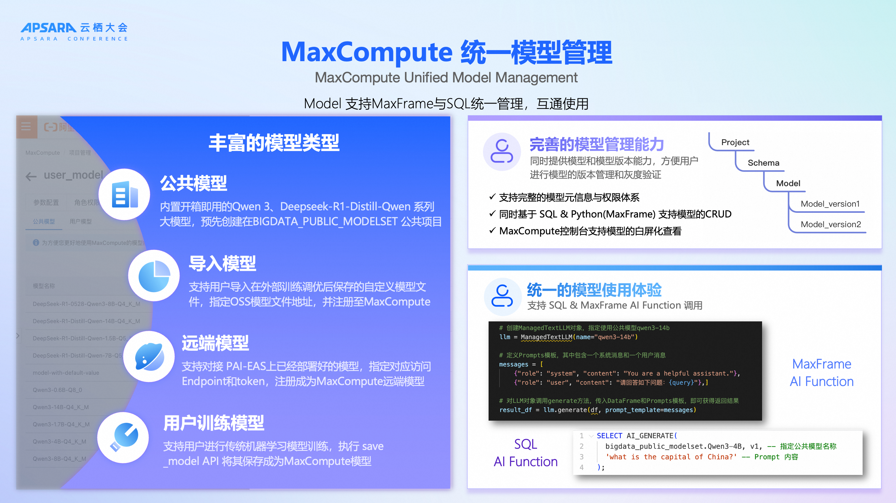 MaxCompute 支持公共模型(如 Qwen3、DeepSeek-R1-Distill-Qwen)、用户导入模型、远端部署模型(如 PAI-EAS 服务)等多种类型,并提供版本控制能力,便于灰度发布与回滚操作。更重要的是,模型可在 SQL 和 Python 两种开发范式中无缝调用。无论是通过CREATE MODEL