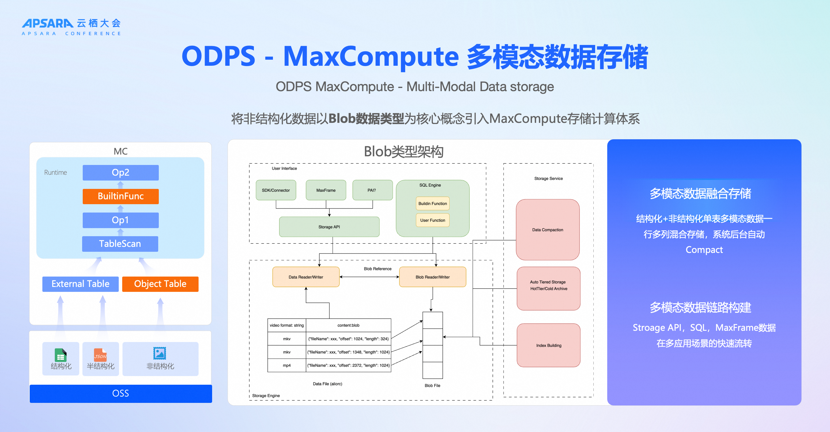 而对于需要深度参与分析与训练的数据,平台推出了 Blob 数据类型,允许将非结构化内容直接写入 MaxCompute 内部表中,与 STRING、STRUCT 等结构化字段共存于同一行。这种混合存储模式,使得图像与其标签、文本与其嵌入向量可在同一记录中管理,为后续的联合查询与 AI 训练提供了坚实基础。