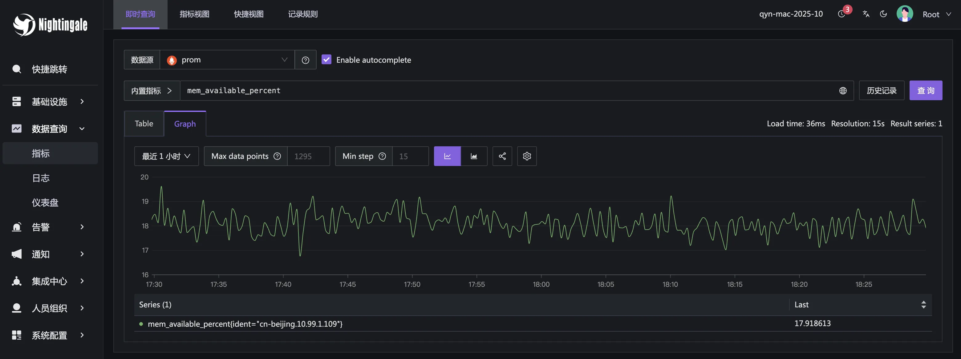 在即时查询里可以看到机器各个指标的历史趋势图,就是 Categraf 采集的监控指标。比如: