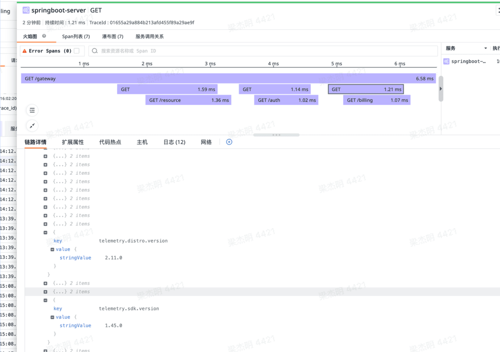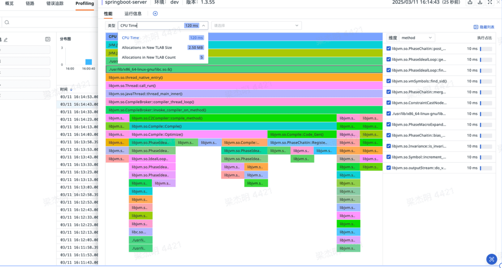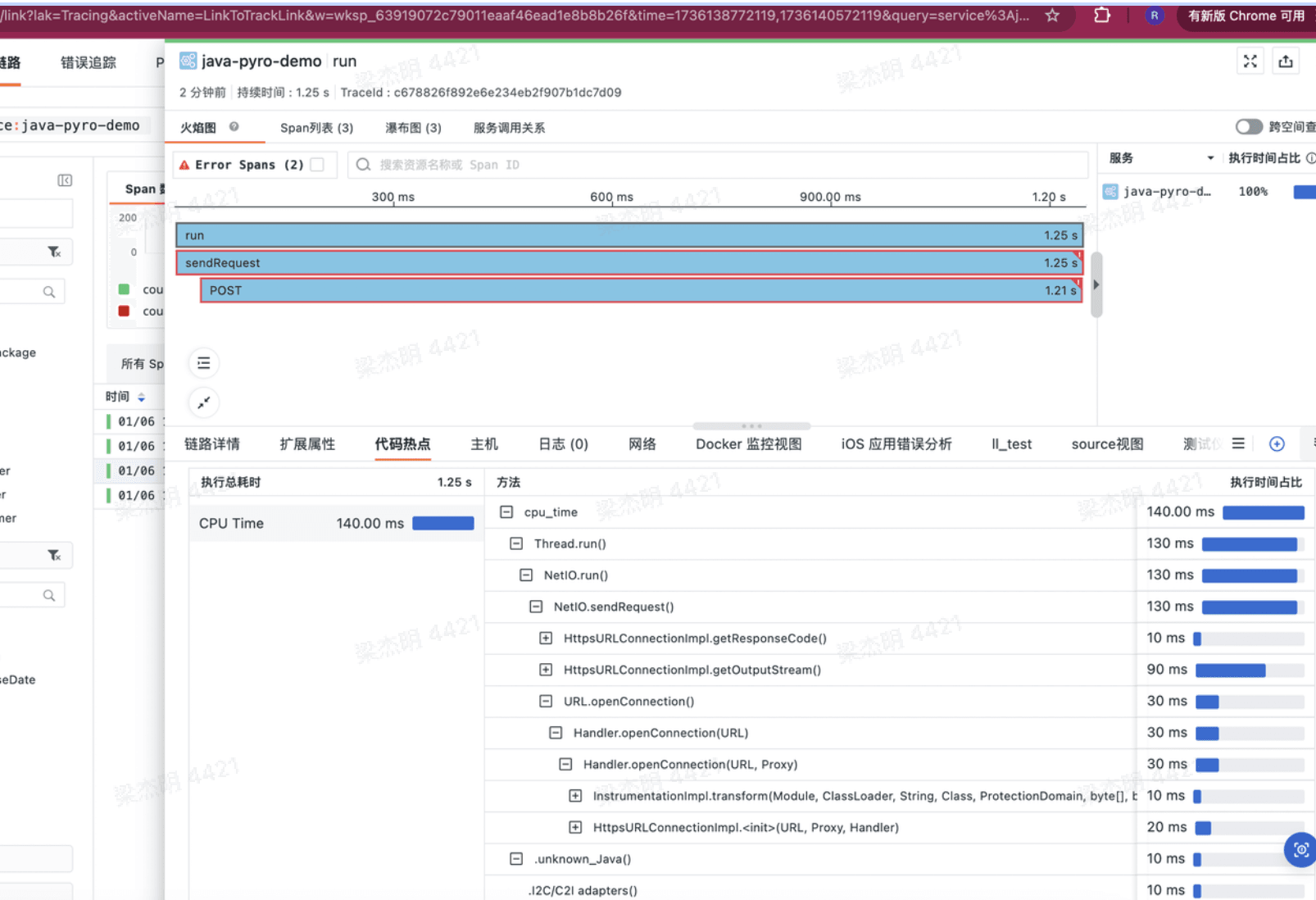 观测云在采集 profiling 数据时可以通过一些配置实现 profiling 与 tracing 数据的关联,其原理主要是通过给 profiling 和 tracing 注入 runtime_id 标签实现关联,在链路中可以点击代码热点,可以看到关联的 profiling 信息。