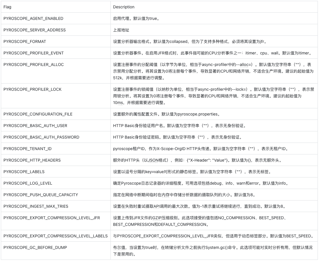 pyroscope 相关参数参考 Pyroscope 官方文档,部分参数说明如下: