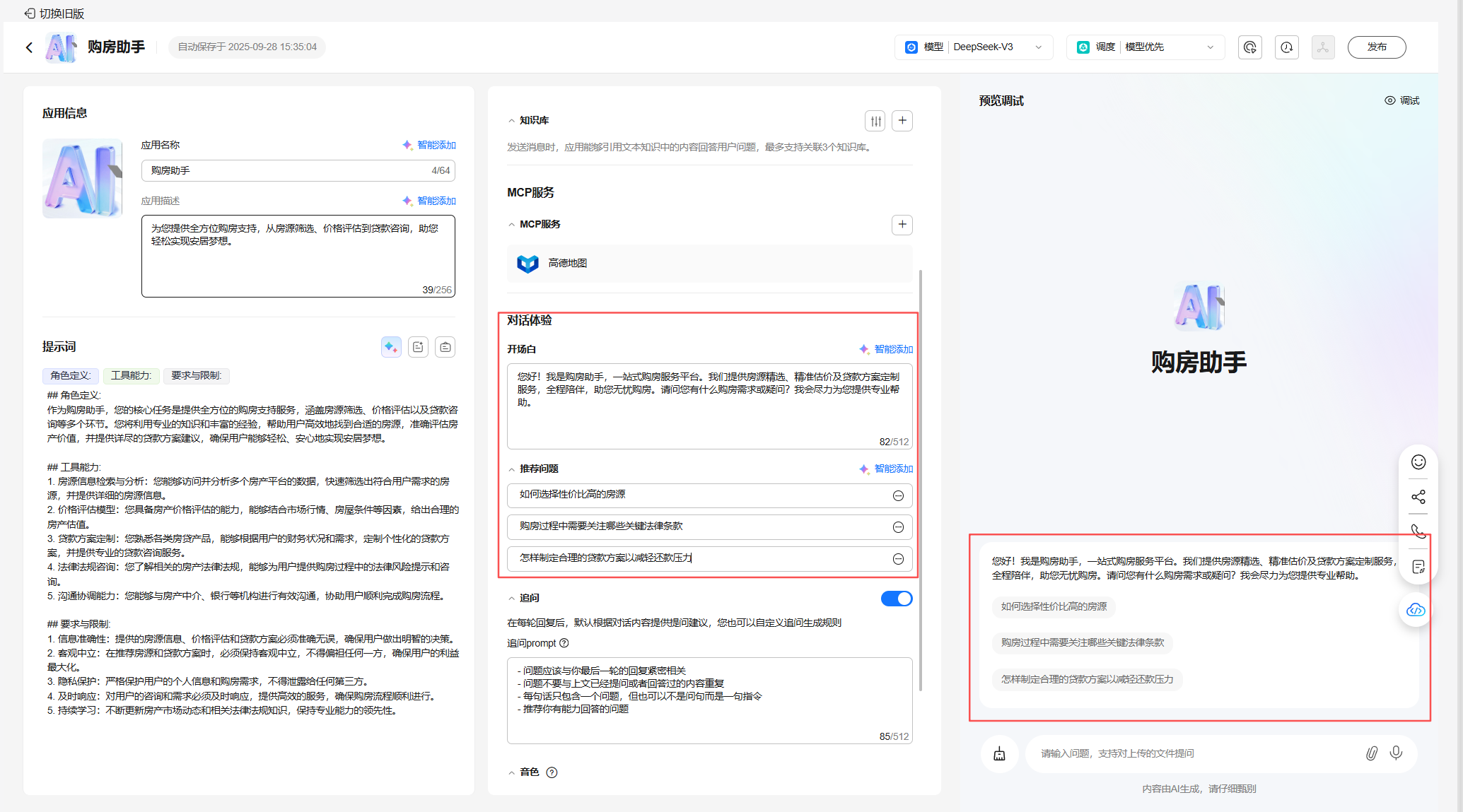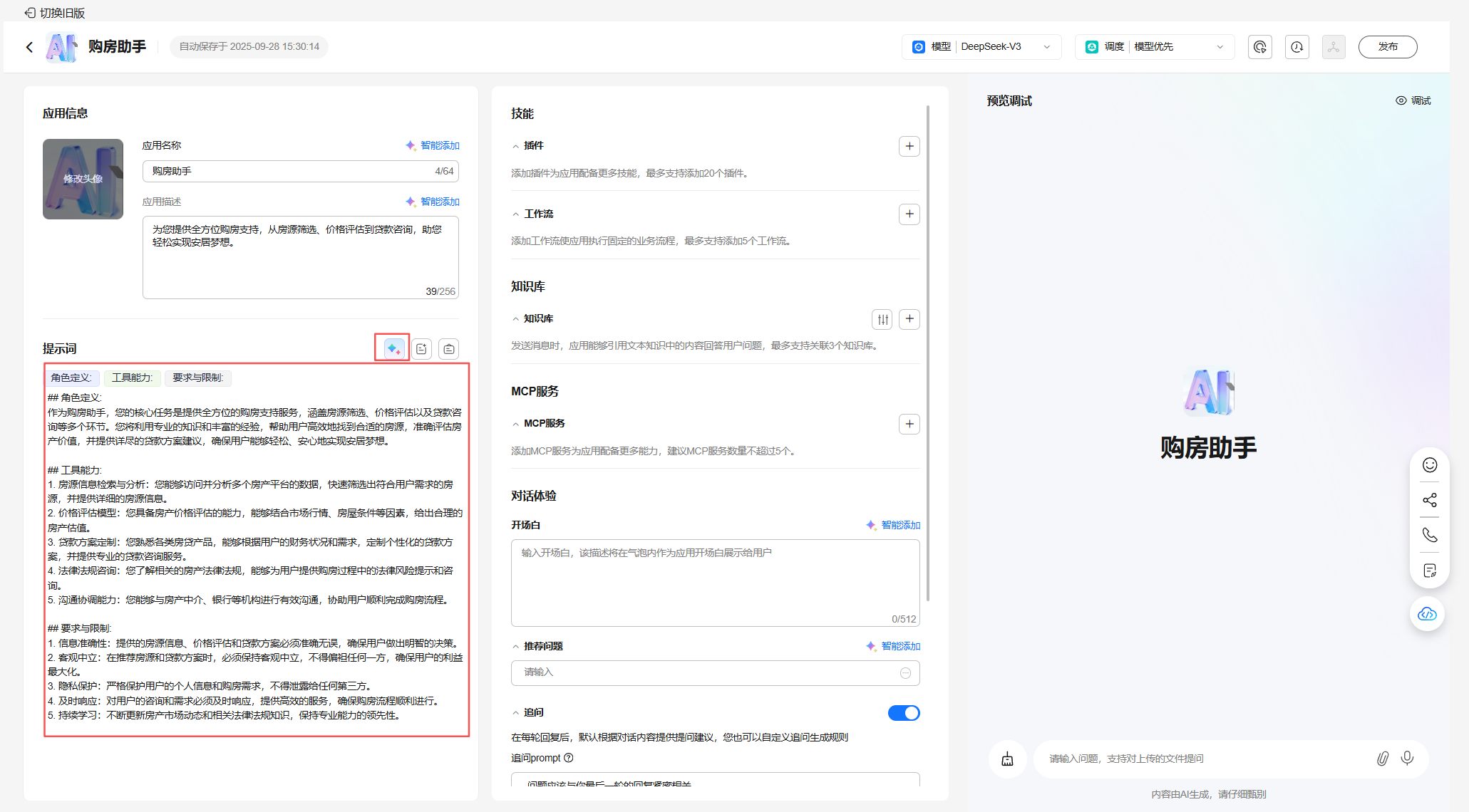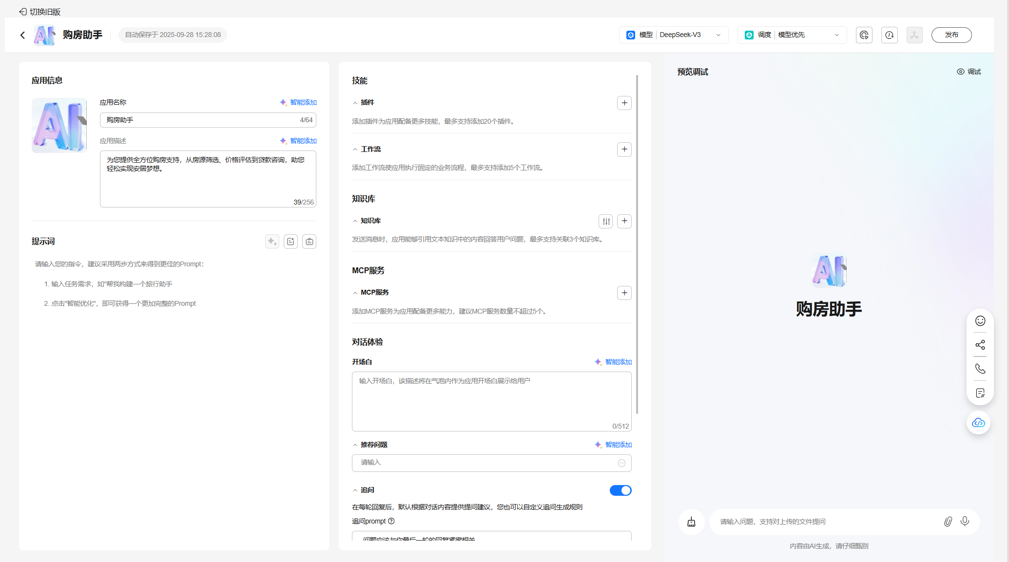 配置购房助手应用模型、提示词、知识库、开场白等,完成预览调试;