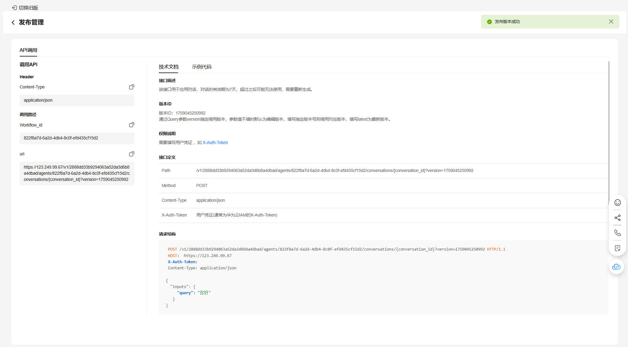 在发布管理界面,可以查看技术文档和示例代码。开发者可进行参考指导将该应用在自己开发的程序中进行调用。