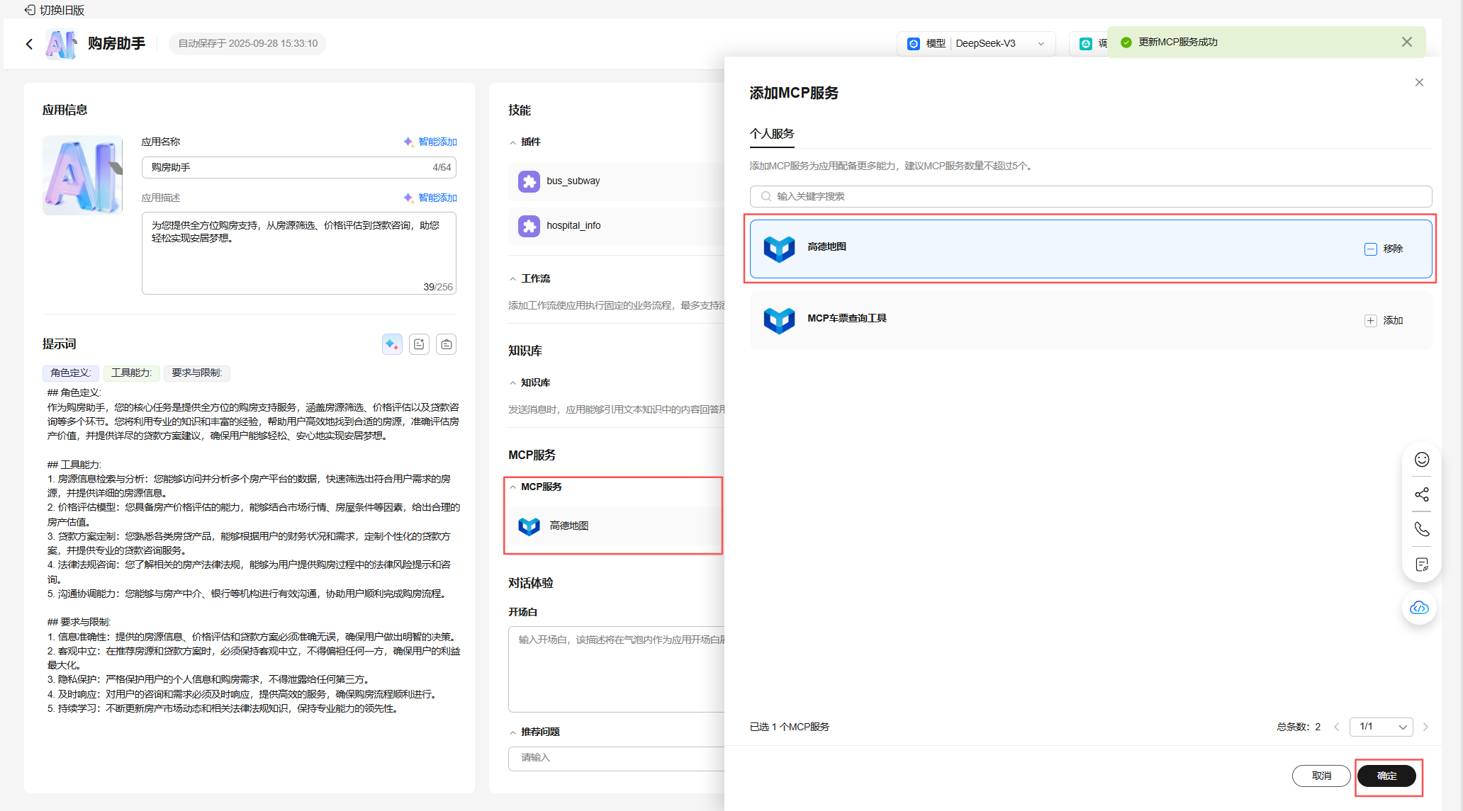 在 MCP 服务配置板块点其右侧的“**+”,在右侧弹出的“抽屉”中找到在“二、资源准备与基础环境配置”章中“3. 配置 MCP 服务”节创建的 MCP 车票查询工具,点右侧的添加,然后右下角的确定**。
