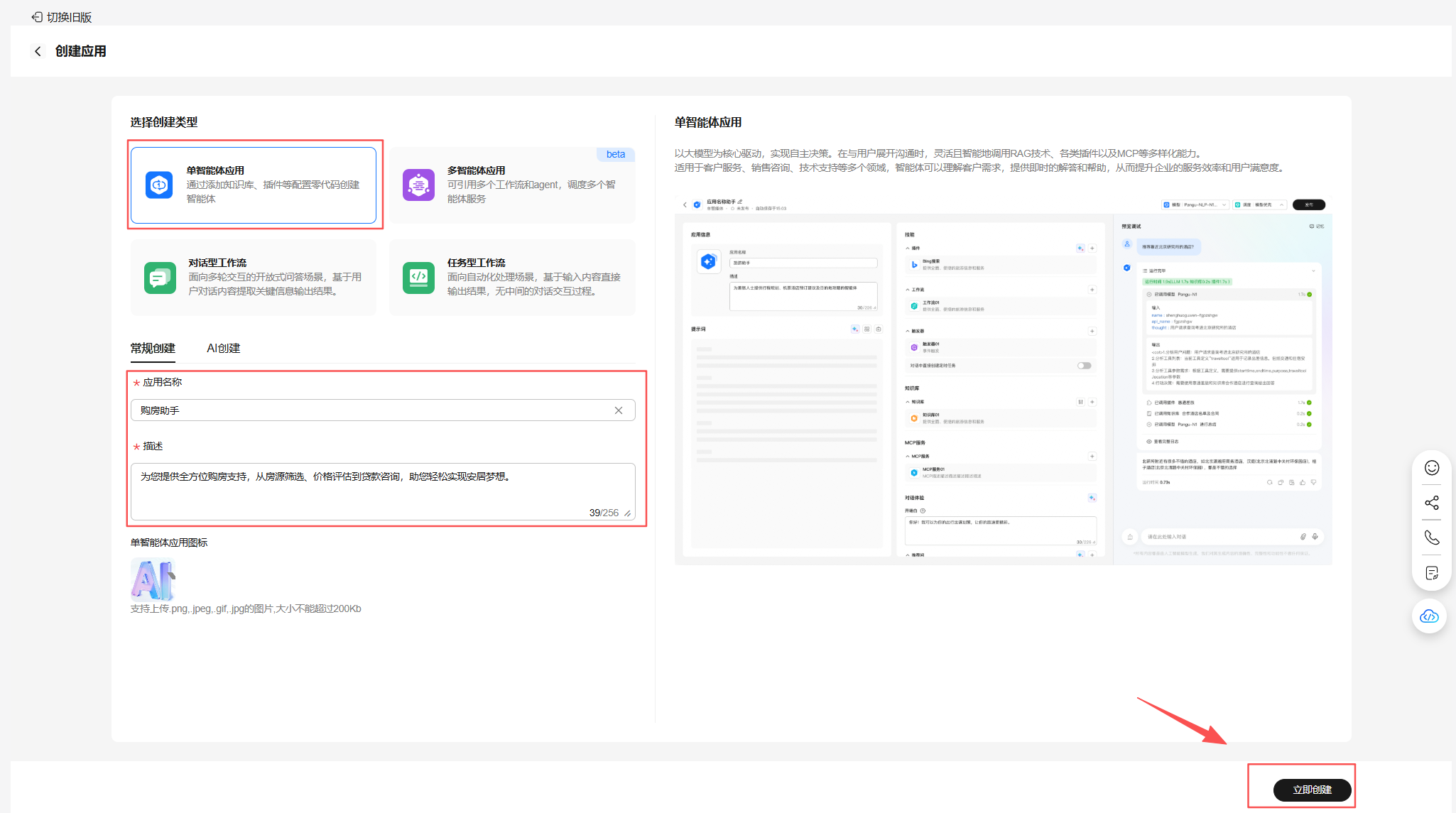 在应用配置界面,创建类型选择默认的单智能体应用,页签选择常规创建,然后配置应用名称及其描述。