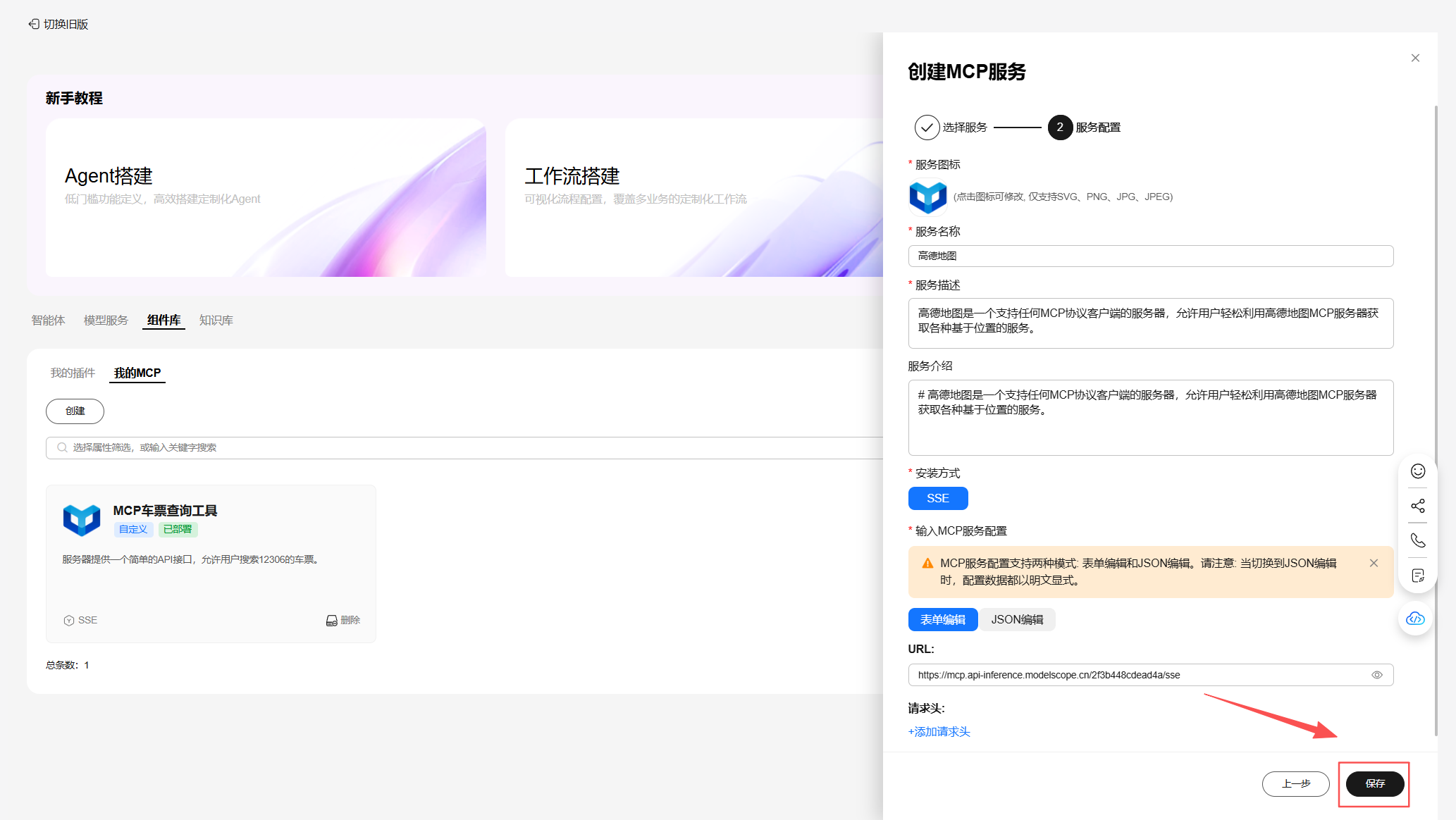 在“2.服务配置”中可根据自己需要修改服务图标、服务名称、服务描述、服务介绍等 MCP 基本信息。修改完成后点右下角保存。