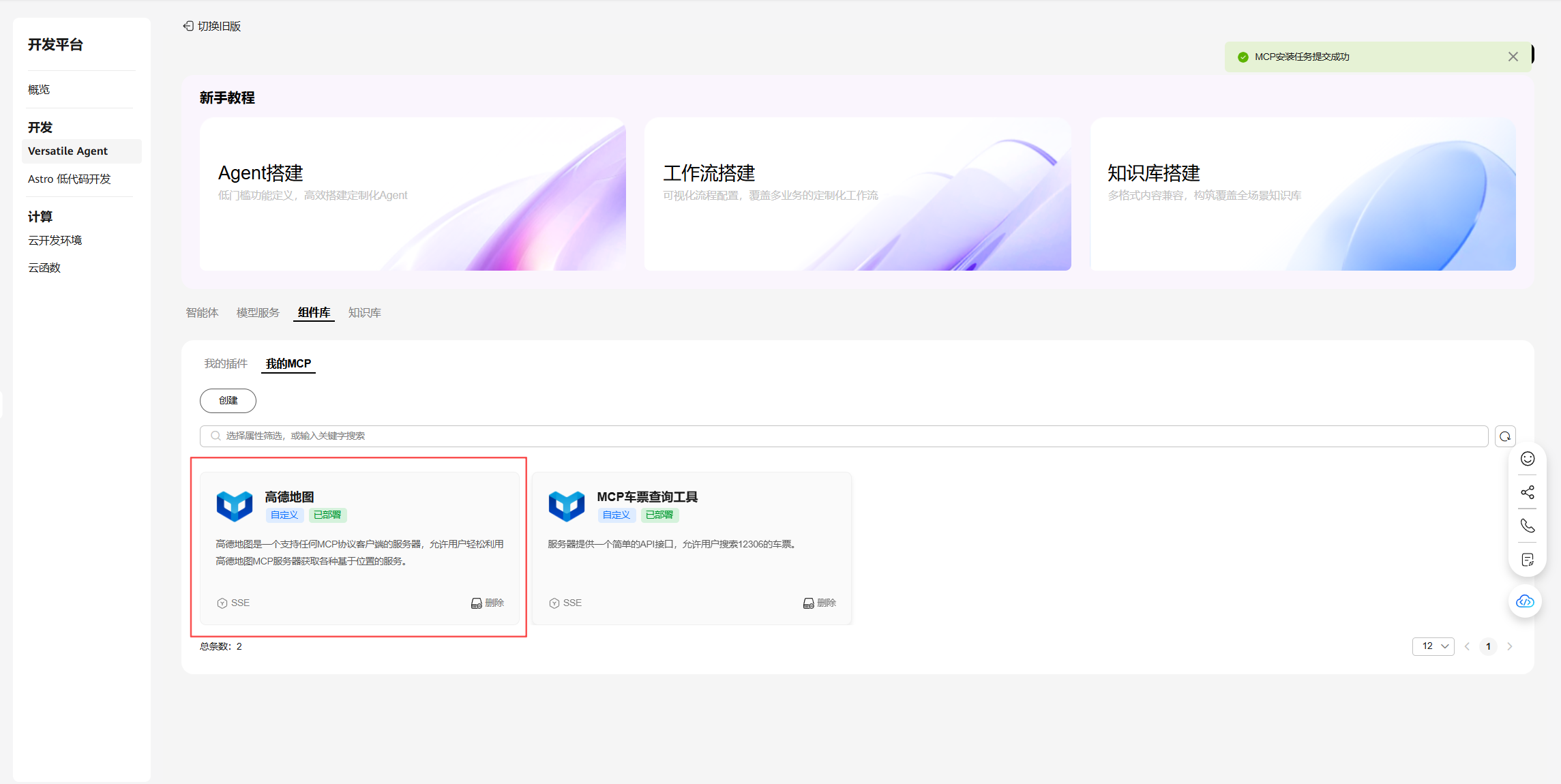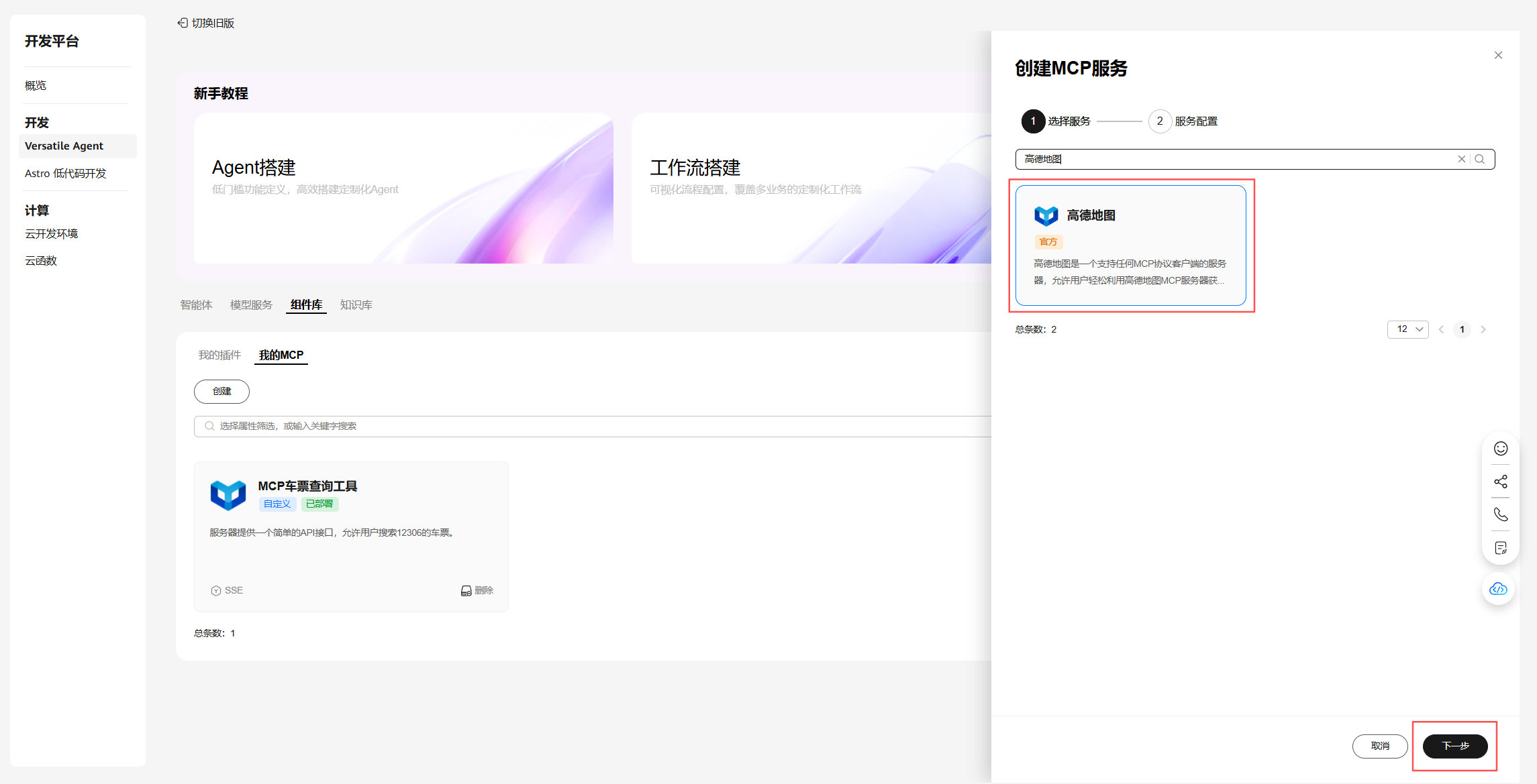 在 Versatile Agent 平台页签选择组件库 > 我的 MCP,点创建。在右侧弹出的创建 MCP 服务“抽屉”,步骤“1.选择服务”中,找到高德地图,选中后点下一步。