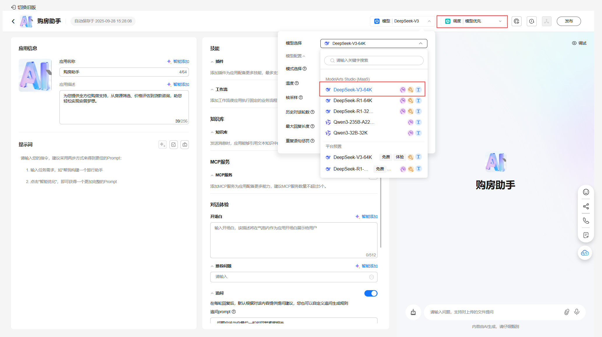 模型选择可以选择平台预置的 DeepSeek,也可以选择前面“二、资源准备与基础环境配置”章中的“2. 配置模型”节配置的 MaaS 模型资源。为了保证应用的运行不受资源限制影响,这里选择 ModelArts Studio(MaaS)模型服务中的 DeepSeek-V3-64K。