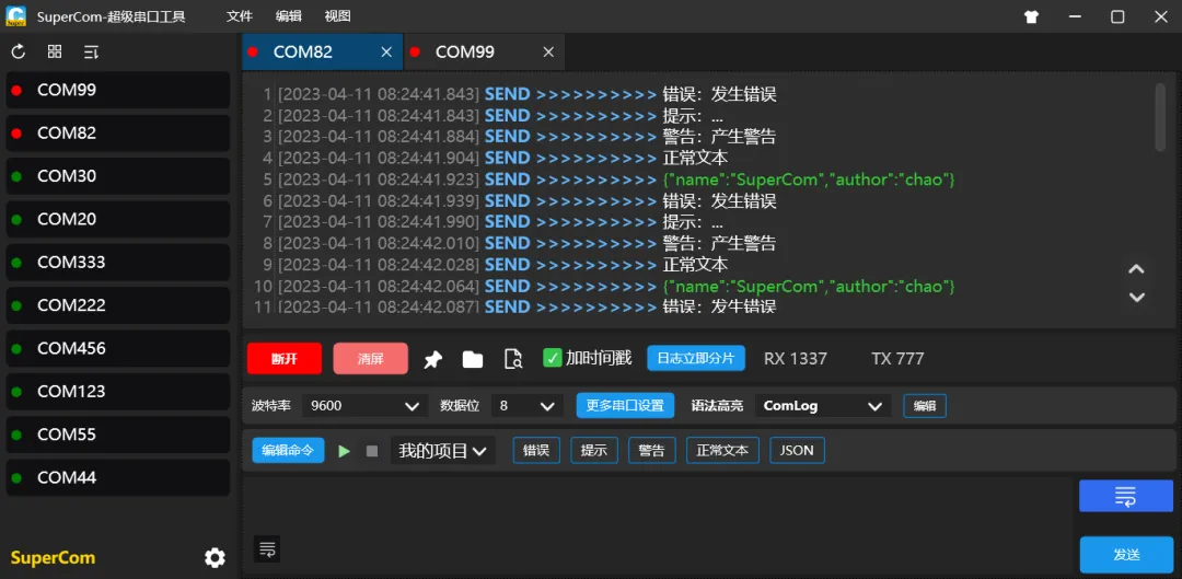 项目简介: SuperCom 是一款基于 .NET 开源(GPL-3.0 license)、美观、流畅、高效、功能丰富的串口调试工具,主要用于 Window 串口日志的采集、存储、可视化等功能。