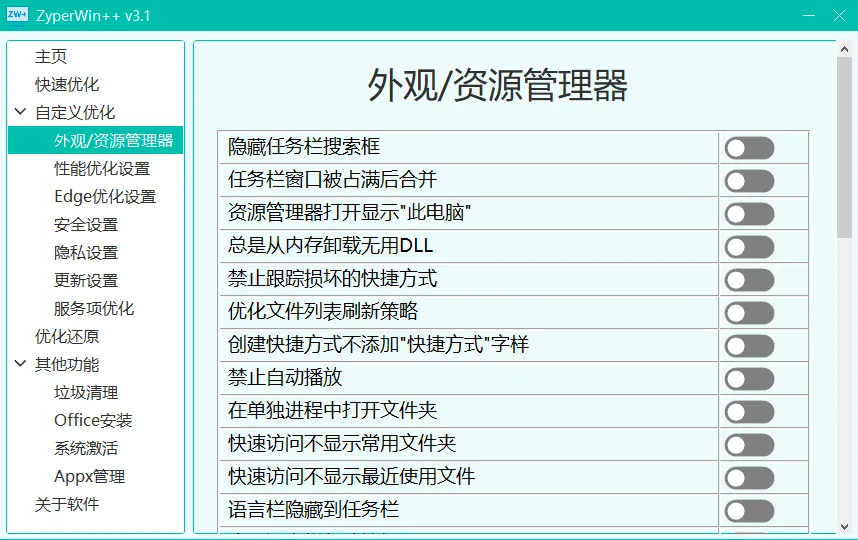 项目简介: ZyperWin++ 是一个基于 .NET + SunnyUI 开源、轻便、简洁美观的 Windows 优化工具,适用于 Win7 - Win11 最新版的优化,包括性能优化、服务项优化、垃圾清理、资源管理器管理、安全设置、隐私设置、更新设置、Appx 管理策略优化等操作,还支持系统激活和 Office 快速安装。