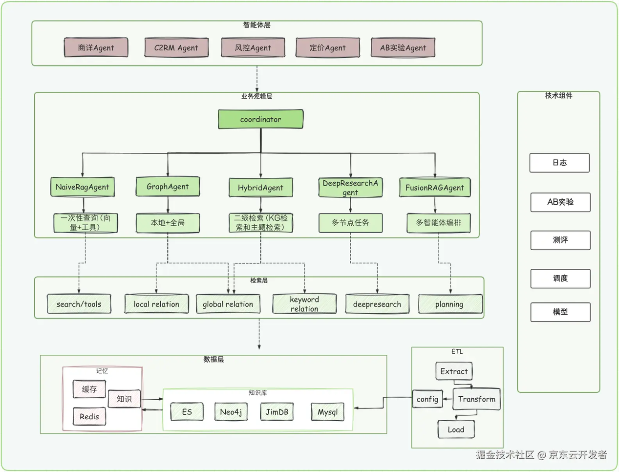工程架构分了四层:智能体层,业务逻辑层,检索层,数据层;技术栈:Spring AI ,Elasticsearch8+,Neo4j,Redis,京东云;技术能力支持上支持 Python Code 和 RAG Agent Workflow。