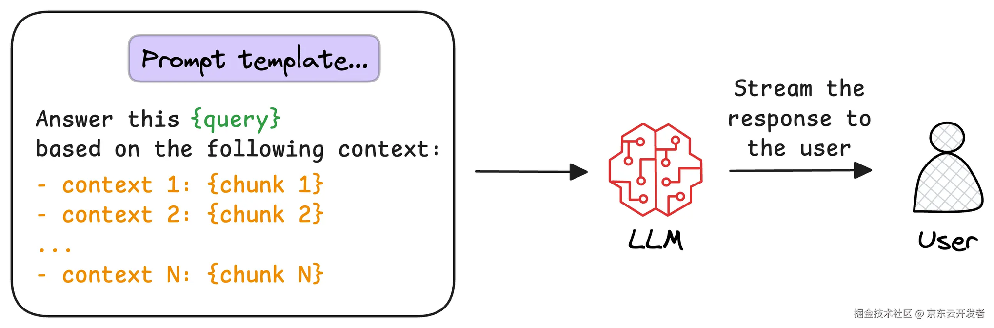 最后一步是生成结果,将原始的查询和检索到的文本块,拼接到 Prompt 中,由大模型生成最终的结果。