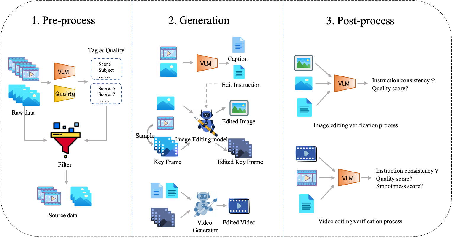 高质量的训练数据是模型的基石。由于广告素材的多样性与复杂性,我们设计了一套 “预处理-生成-后处理” 的数据自动化生成链路,系统性地构建了百万量级的商业化场景数据集,覆盖文本、图像、视频模态,基本囊括了所有常见广告场景,其中图像和视频数据生成链路如图 6 所示。