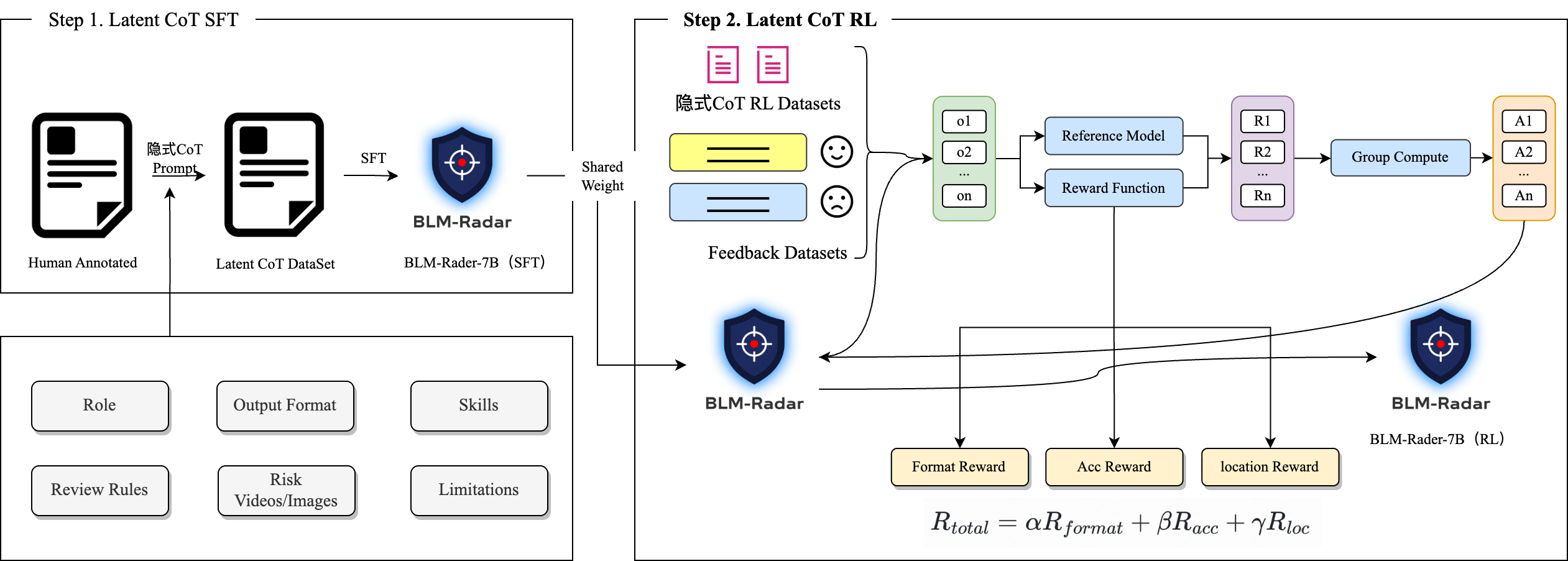 为从根本上解决这一问题,我们摒弃了传统架构,训练了一个“识别与定位一体化”的端到端模型。主要包含两个核心环节:即 CoT SFT 和 RL 环节,将风控审核规则与大模型深度融合,完成风险定位能力建设。