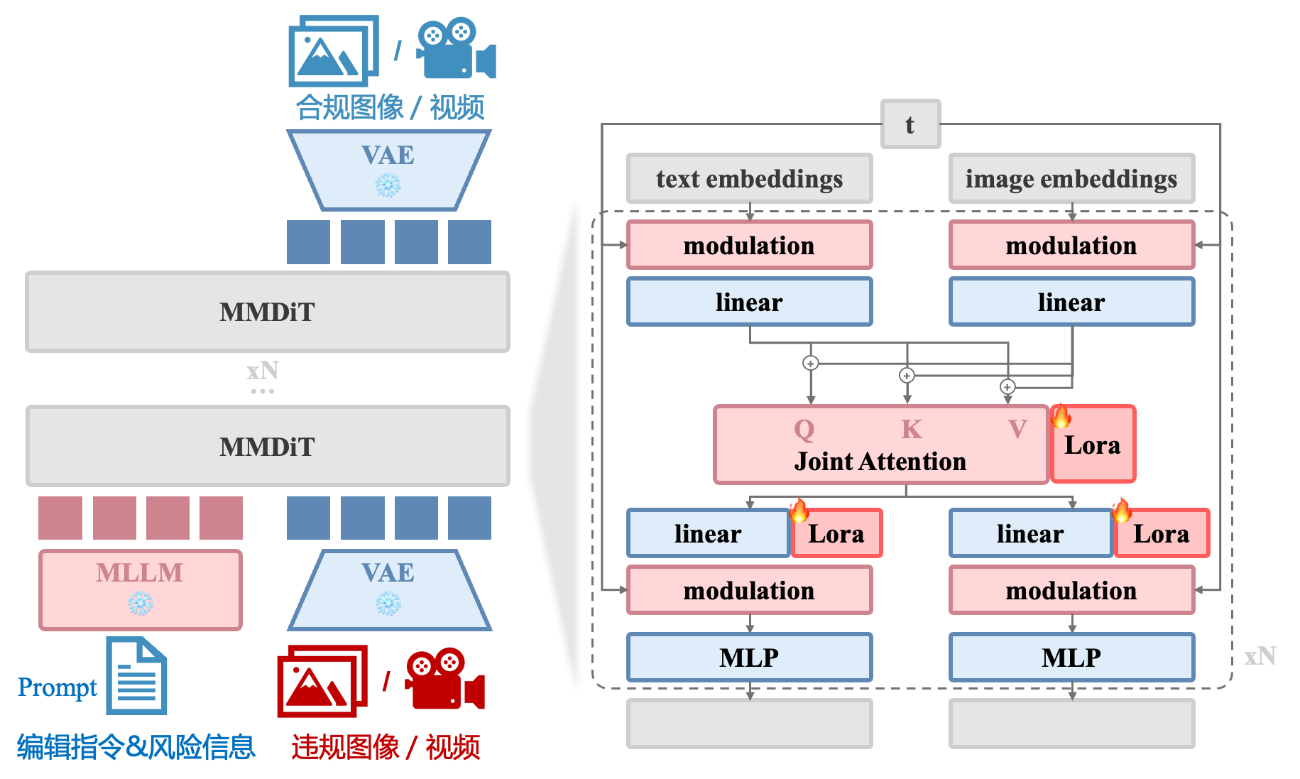 我们采用 DiT 架构作为模型主干,并通过 LoRA 微调等技术大幅降低训练成本。为了让模型精准理解“怎么改”、“改哪里”和“为什么改”,我们将编辑指令与风险定位信息作为控制条件输入。
