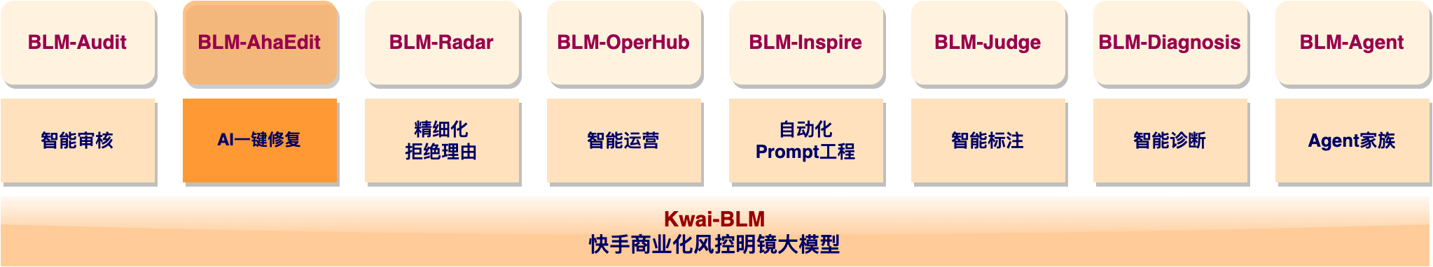 在商业化生态安全场景下,商业化风控围绕自建风控明镜大模型 BLM,依据业务所需构建了系列大模型。专门用于修复素材的就是其中的 BLM-AhaEdit,这个名字取自“Aha Moment”——期望每一次修复,都不只是简单的合规通过,而是一个能激发灵感、实现“点石成金”的“顿悟时刻”。