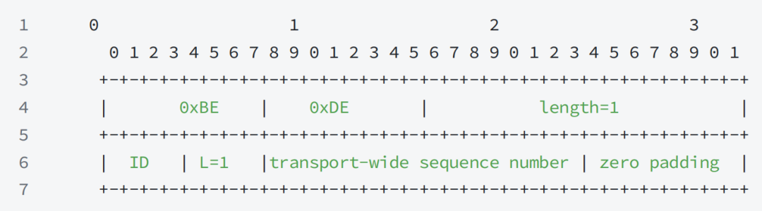 这里是单个字节表示扩展头(0xBEDE)为标识符,length = 1,表示该扩展占有 4 个字节,L=1,表示 Transport-wide sequence number 占 2 个字节。