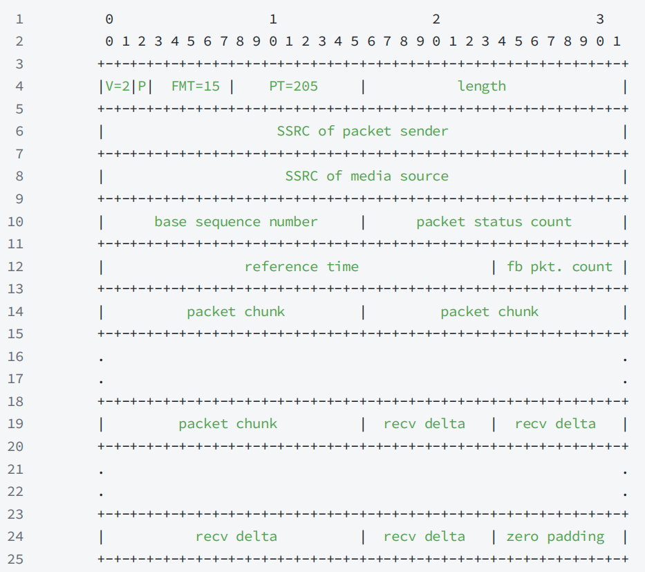 接收端在 TFB-GCC 框架下,主要是定期发送 Transport-wide 反馈包,用来告知发送端,接收端收包相关信息,包括包的到达情况及包的到达时间等信息,其消息格式及核心字段解析如下: