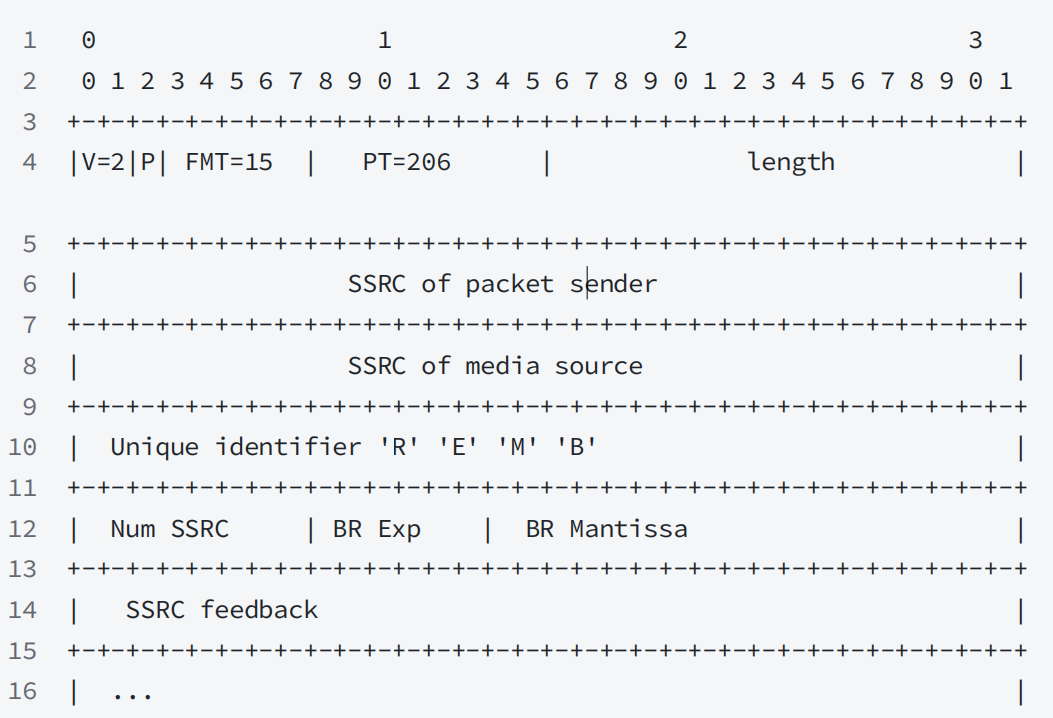 Remote Rate Controller 子模块计算出最终的接收端的评估带宽后,将通过 REMB RTCP 报文反馈到发送端,用来告知发送端接收端评估的链路带宽。REMB 的报文格式如下所示: