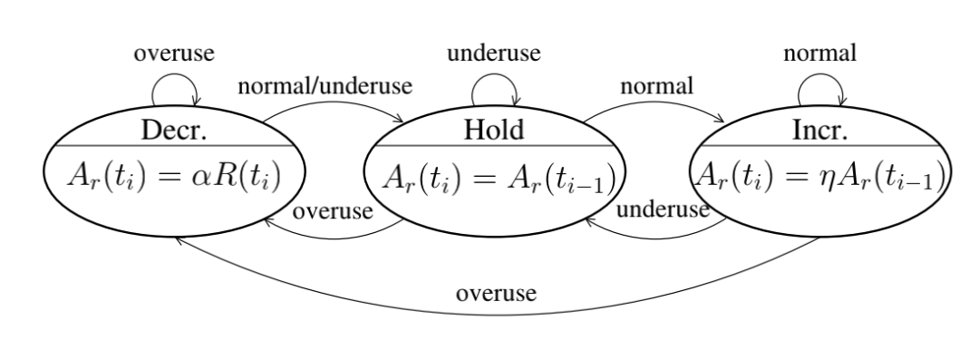 根据上节计算出来的 mi 和阈值 γi 判断当前网络的状态,是否过载、低负载还是正常,根据网络状态确定接下来对带宽估计的调整,是增加、降低还是保存不变,这个和 REMB-GCC ⼀样。