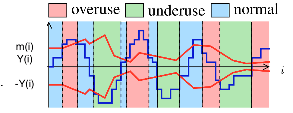 该模块根据 Arrival filter 估测的 mi 来定时更新阈值 γi,mi 和 γi 将作为 Overuse Detector 模块的输入,评估当前网络是否处于过载状态。