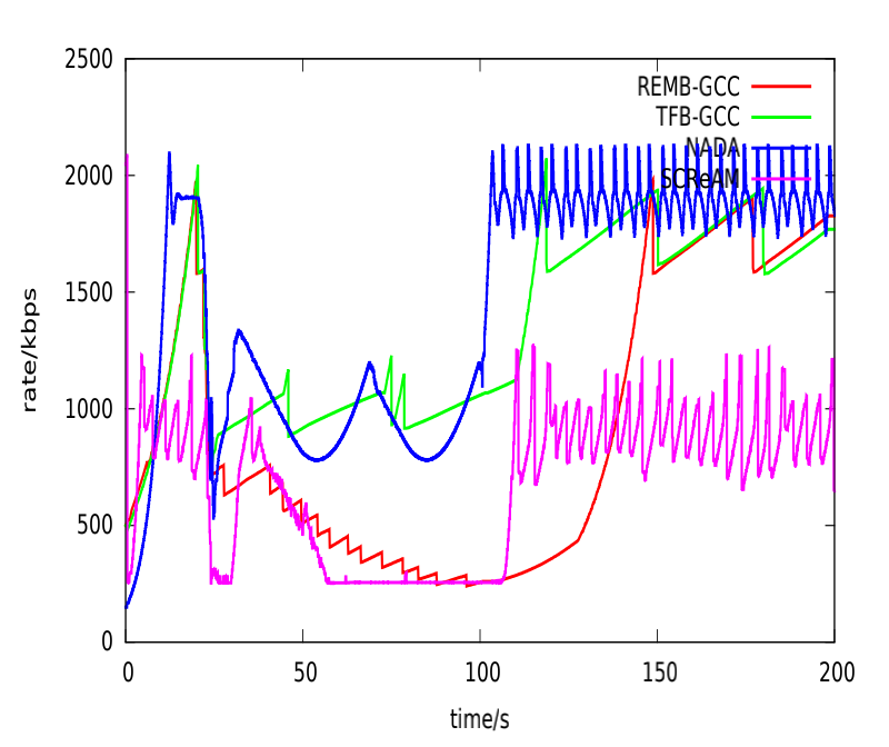 论文[4] 给出了 TFB-GCC 和 REMB-GCC 的一个带宽受限的比较,可以看出 TFB-GCC 效果较 REMB-GCC 恢复更快,跟随链路带宽更准确,整体效果更好。