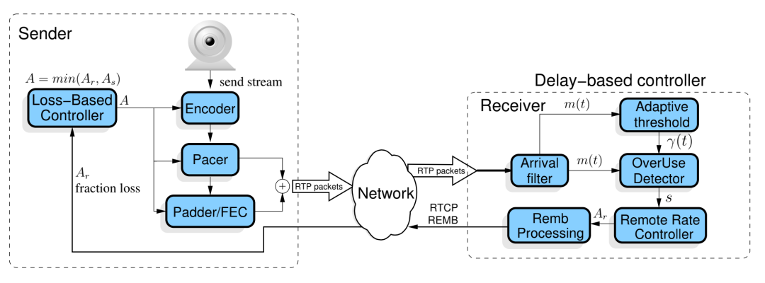 该算法有两个版本,一个版本是分布在发送端和接收端,接收端通过对延迟进行估计,并通过 REMB RTCP 报文反馈评估出来的带宽;发送端则根据丢包率和接收端反馈的带宽来计算最终的代码码率,进而调整编码器编码码率,这个框架将其称之为 REMB- GCC。