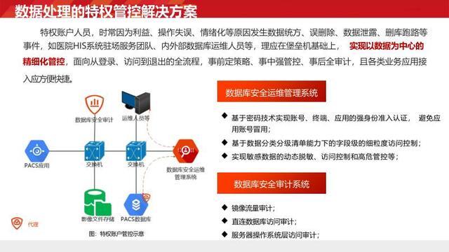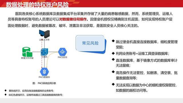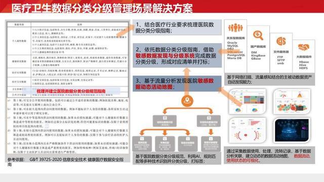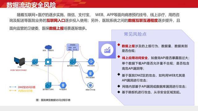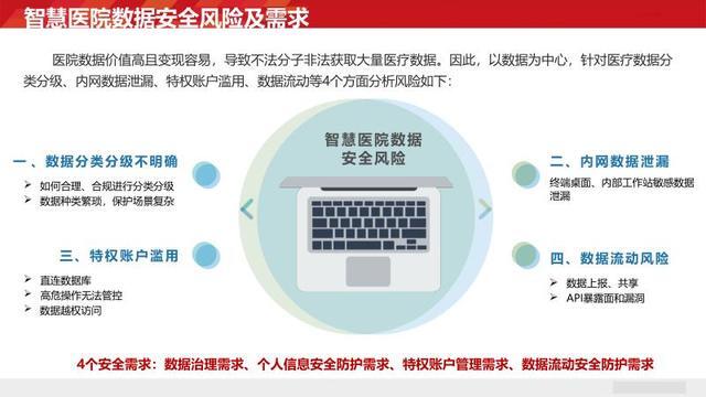 主要涵盖以下四个方面。首先,数据治理需求。鉴于医疗数据种类繁多,必须制定清晰明确的分类分级标准,以应对复杂多样的保护场景。其次,个人信息安全防护需求。要着重防范内网终端的数据泄露风险,防止医护人员、运维人员等因违规操作导致信息外流。再者,特权账户管理需求。需防止运维人员、管理员等利用特权账户直接连接数据库,对高危操作和越权访问行为进行有效管控。最后,数据流动安全防护需求。要确保线上应用的 API 安全,规范数据上报流程,抵御外部的各类攻击。