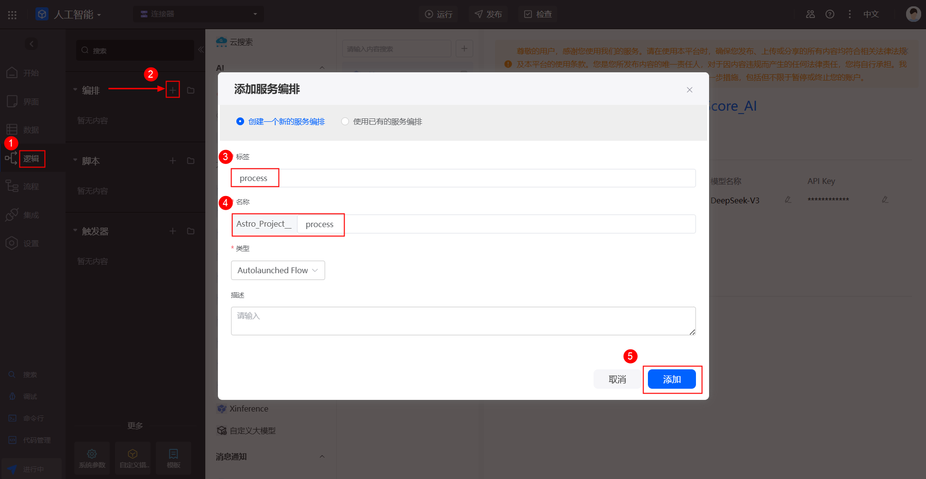 点击逻辑->编排旁边的“+”,添加编排服务,标签为 process