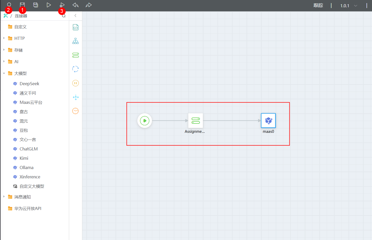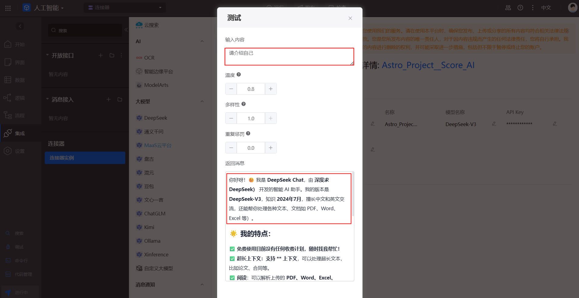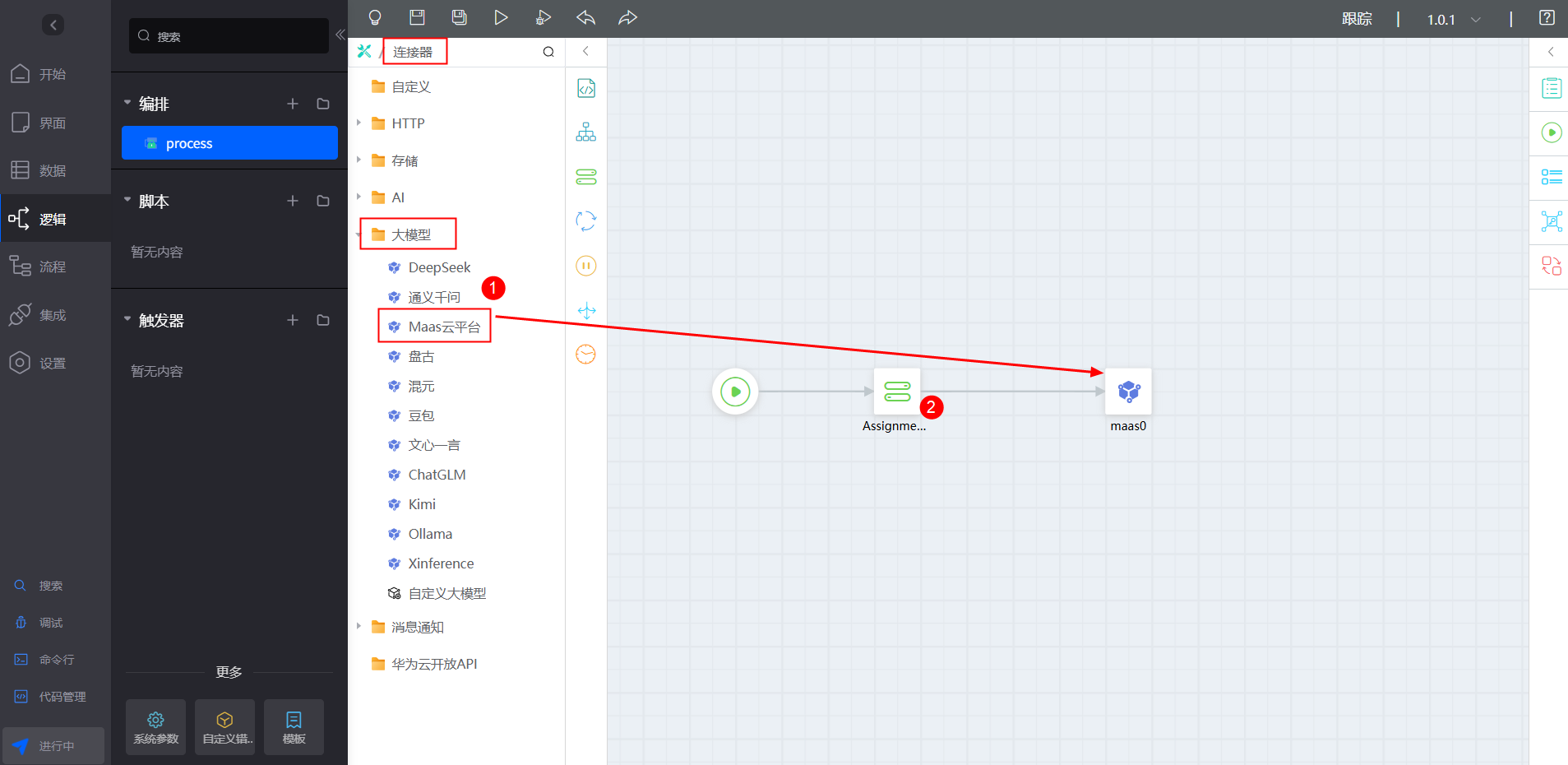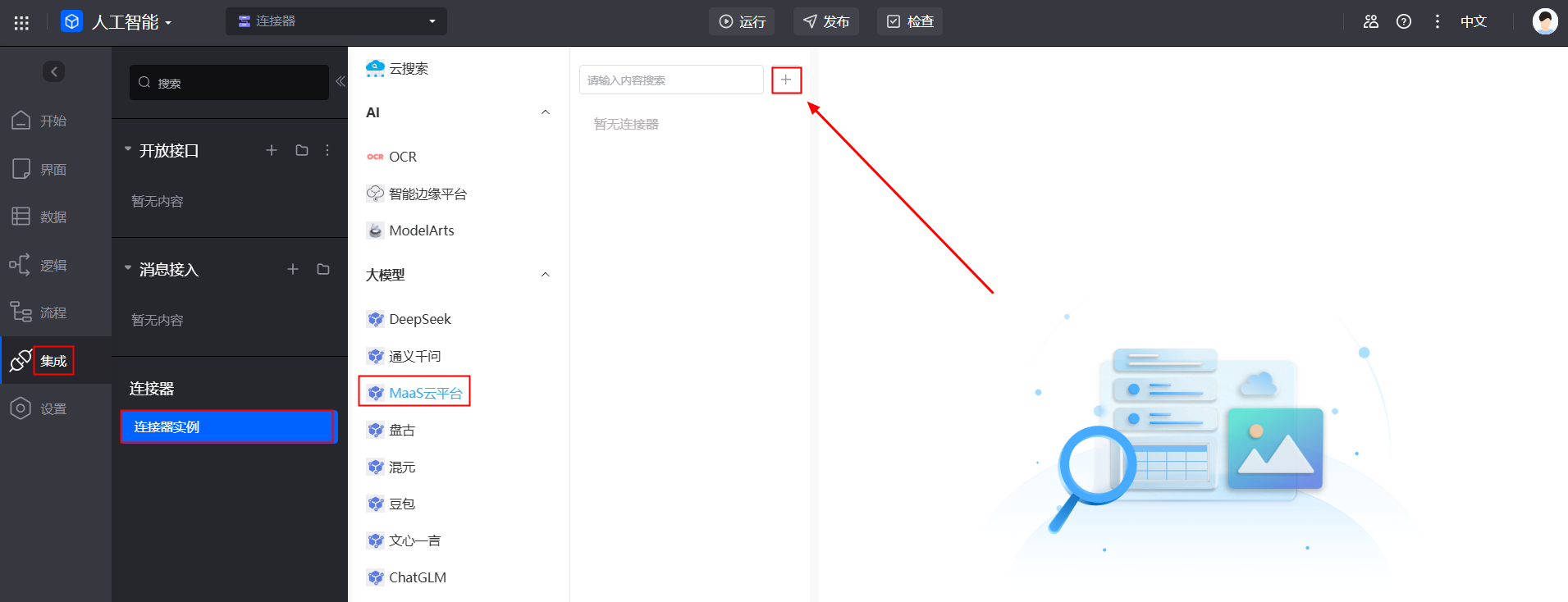 点击集成->连接器实例->MaaS 云平台,点击“+”添加大模型: