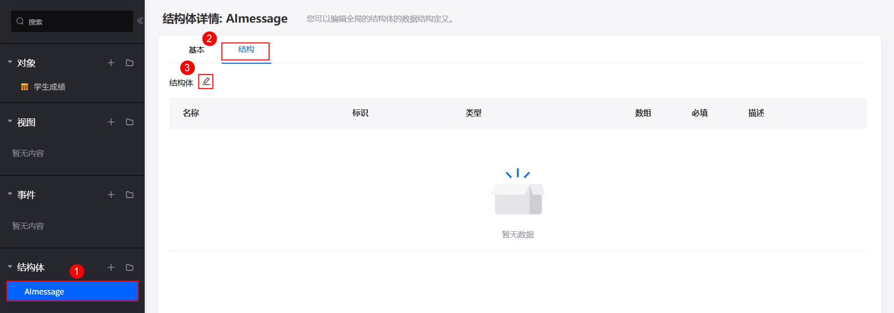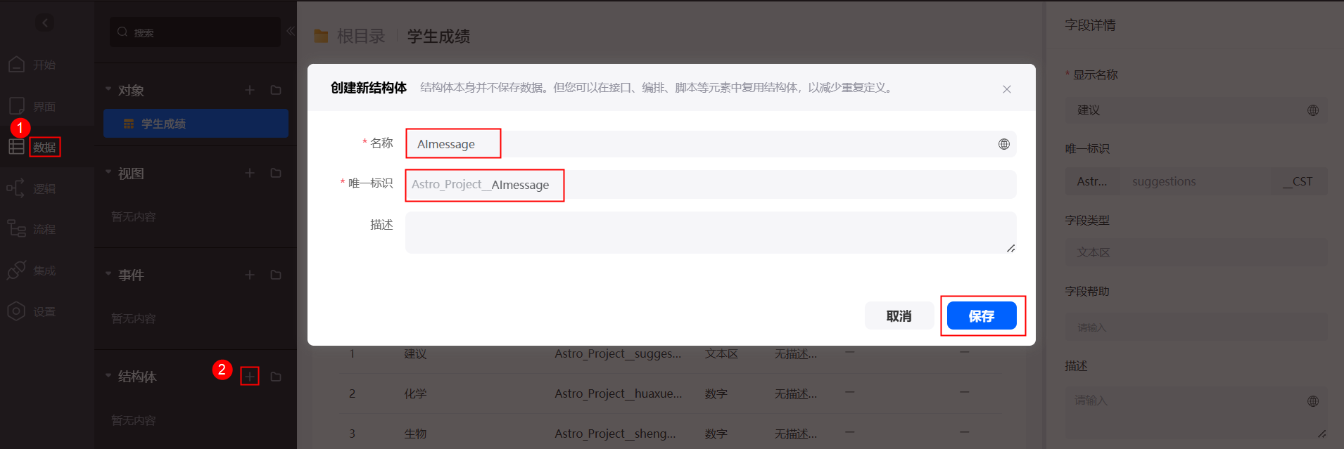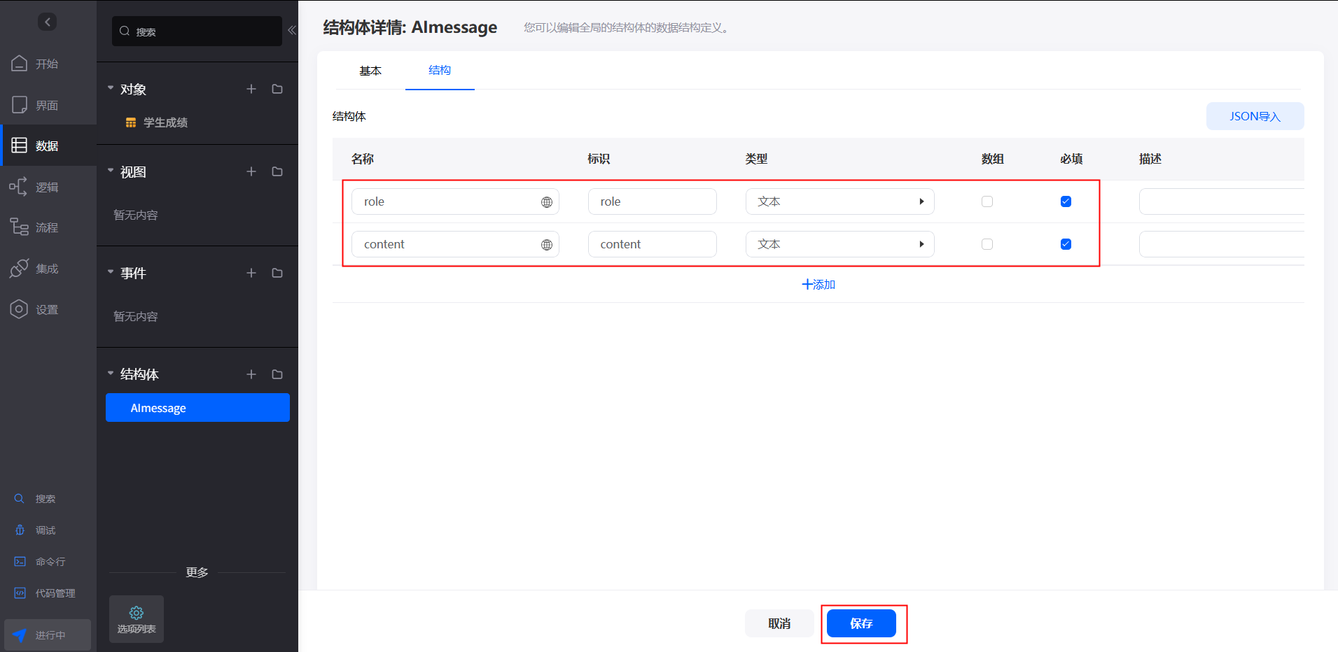 点击数据->结构体旁边的“+”,创建结构体:AImessage