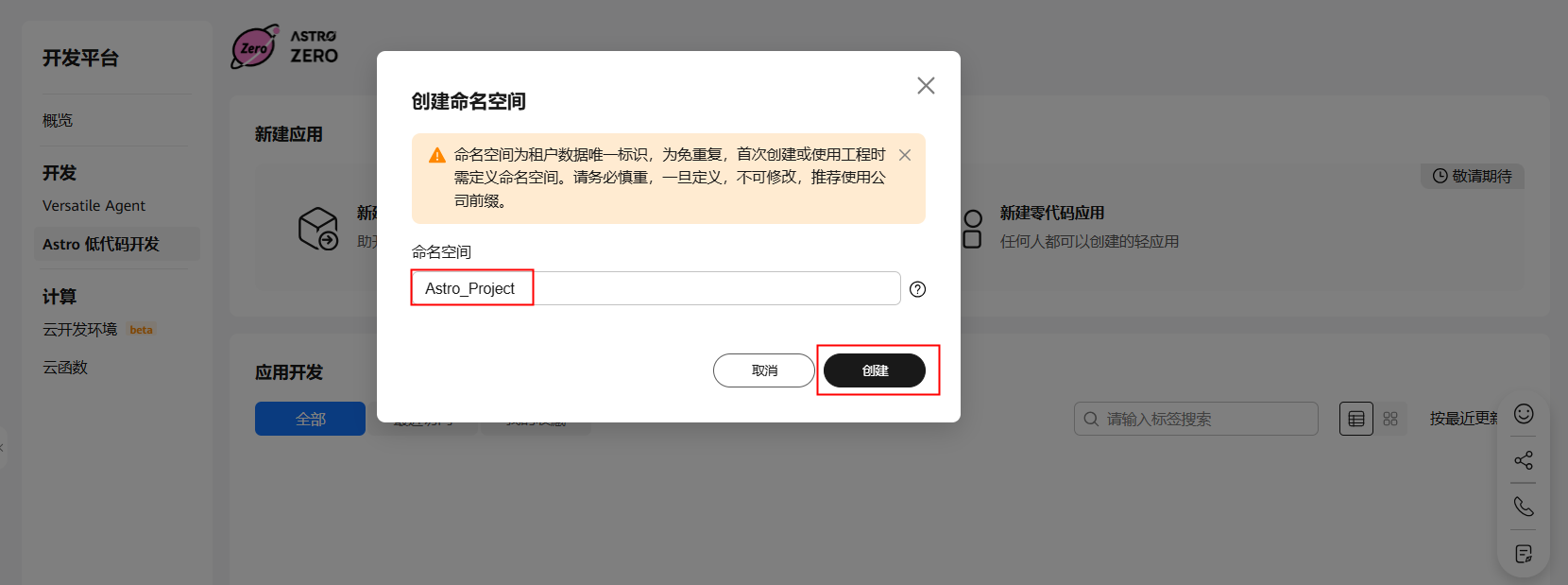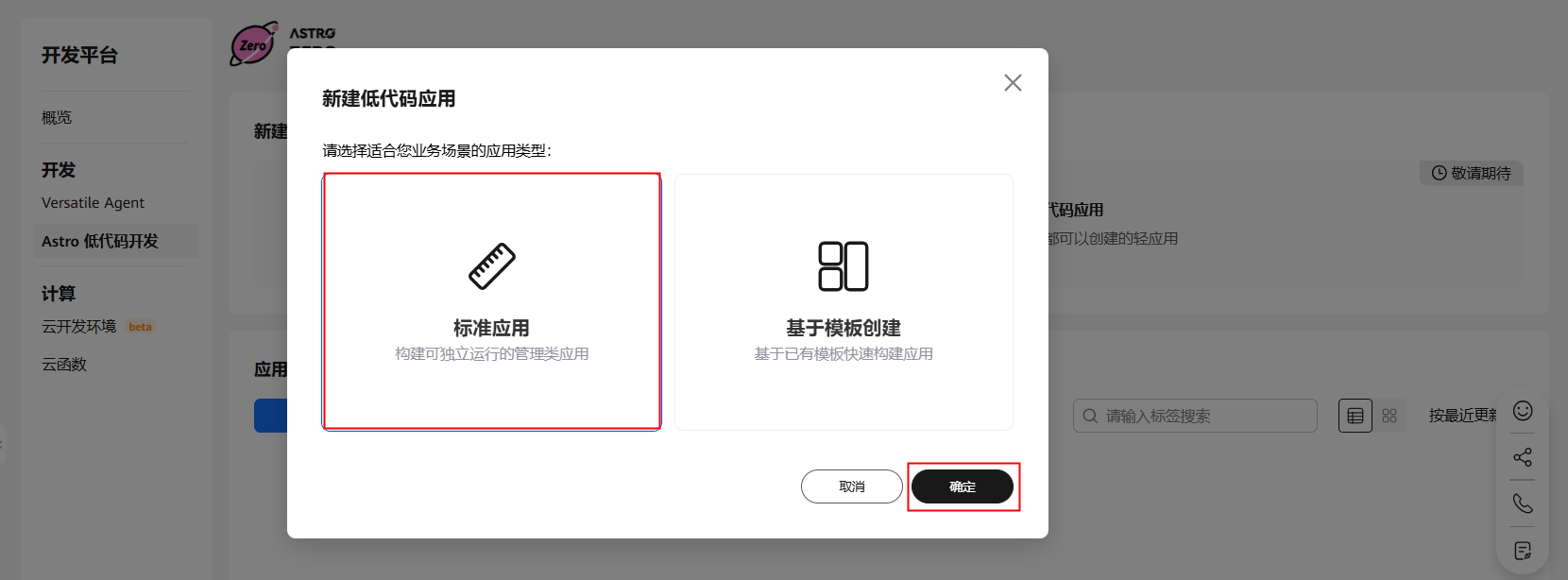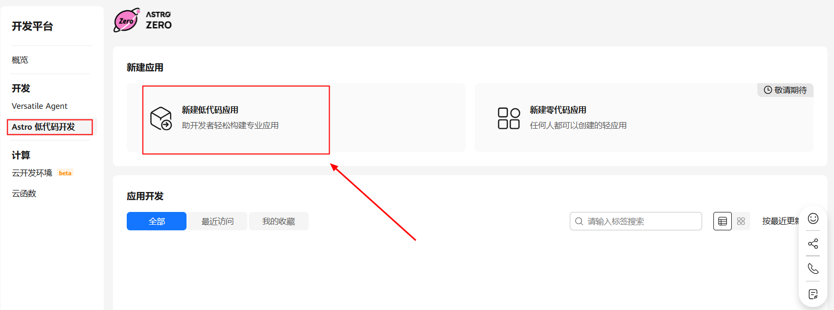 新建低代码应用,进入 Astro 轻应用服务控制台主页,开发应用。
