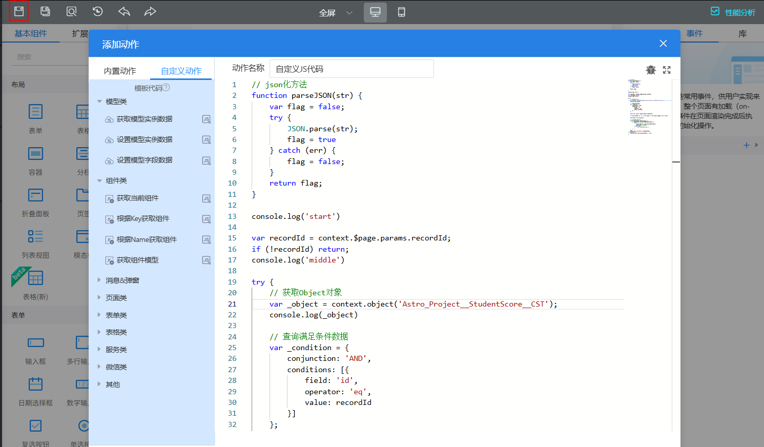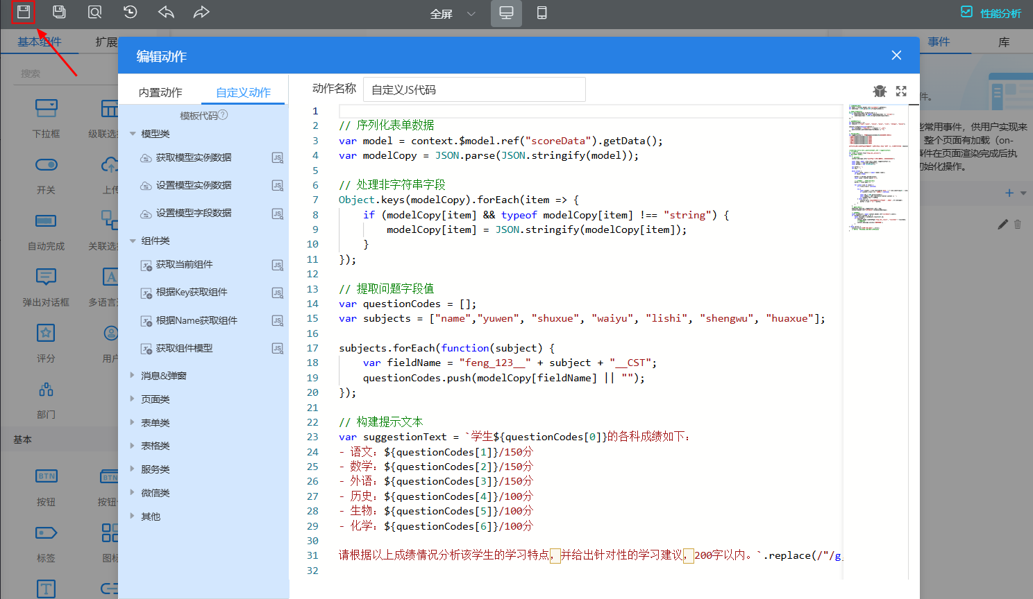 // 提交数据 const saveResult = await context.$model.ref("scoreData").save(); if (saveResult.resCode == 0) { const recordId = saveResult.result[0]?.id; if (recordId) { context.$page.loadStdPage('Astro_Project__result', "recordId=" + recordId); // 成功消息 context.$message.success('生成成功'); } }} catch (error) { console.error("AI服务调用失败:", error); // 可以添加错误处理逻辑,如显示错误信息}