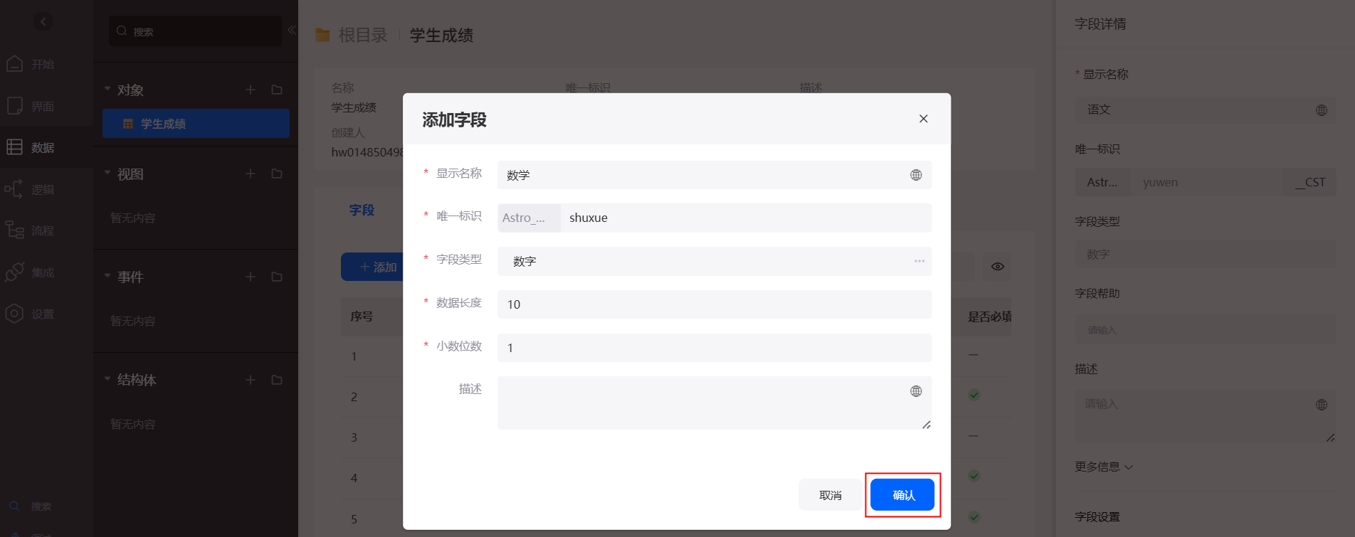 输入对象名称:学生成绩,唯一标识:StudentScore