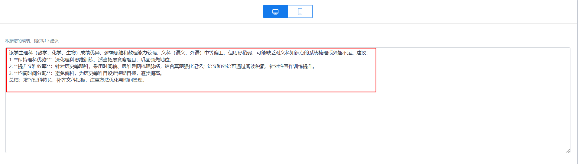// 构建提示文本var suggestionText = `学生${questionCodes[0]}的各科成绩如下:- 语文:${questionCodes[1]}/150分- 数学:${questionCodes[2]}/150分 - 外语:${questionCodes[3]}/150分- 历史:${questionCodes[4]}/100分- 生物:${questionCodes[5]}/100分- 化学:${questionCodes[6]}/100分