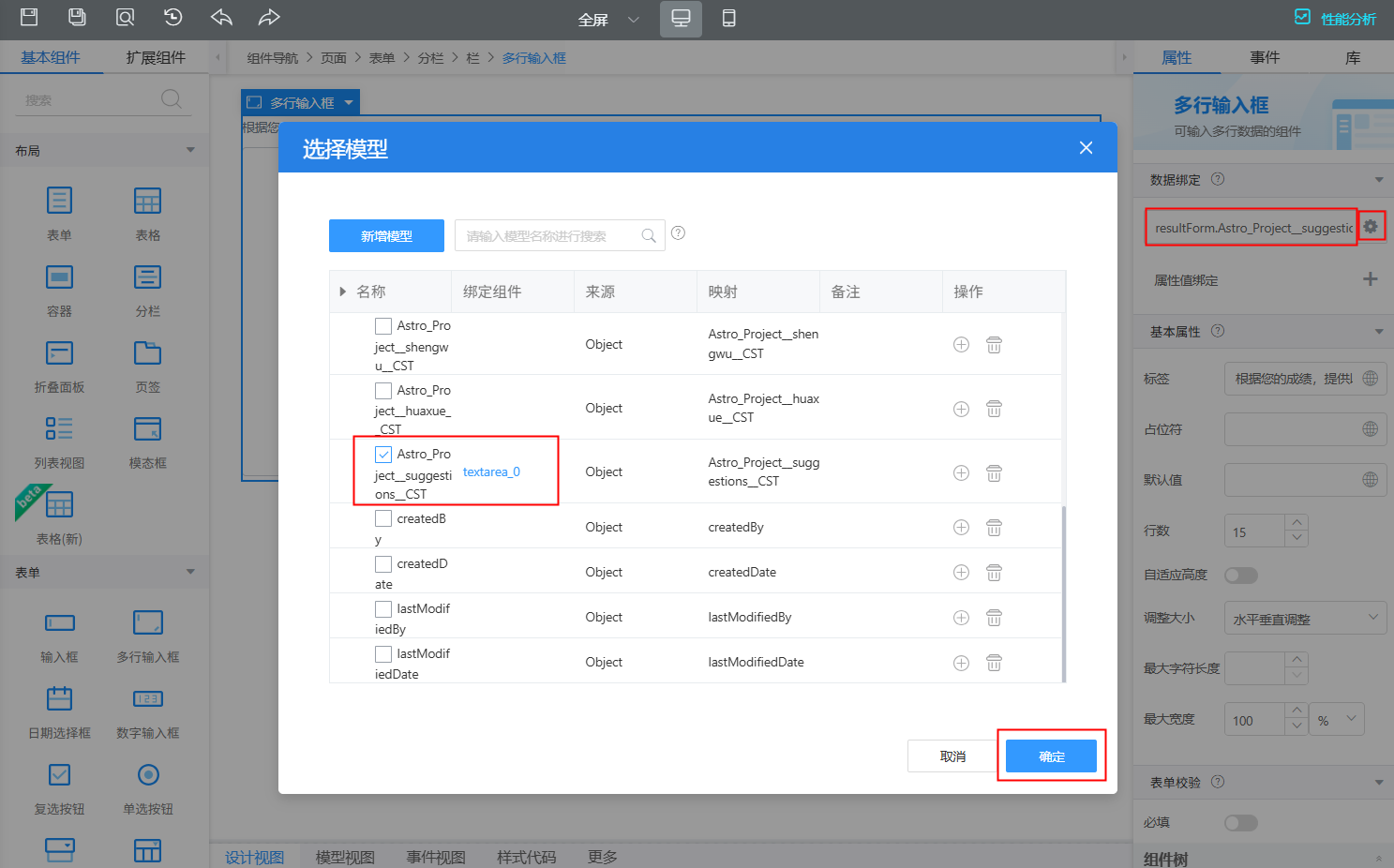 多行输入框数据绑定,绑定 Astro_Project_suggestions_CST 字段。