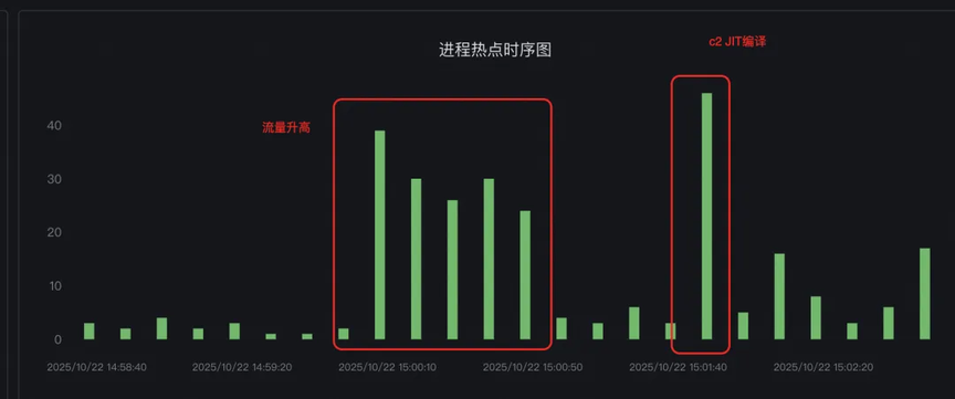 通过热点栈和热点分析对比,发现内存突增时间点的 cpu 栈也是 c2 compiler 的 JIT 栈,且 c2 compiler 热点前有部分业务流量突增,且业务代码使用了大量反射操作(反射操作会导致 c2 compiler 进行新的预热)。