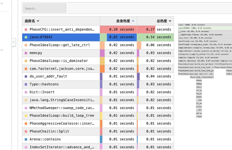 但是由于诊断的过程中没有发现 pod 有内存突增;所以我们进一步借助可以常态化运行的 Java CPU 热点追踪功能[5]尝试抓取内存升高时的进程热点,并通过热点对比[6]尝试对内存正常时的热点进行对比。