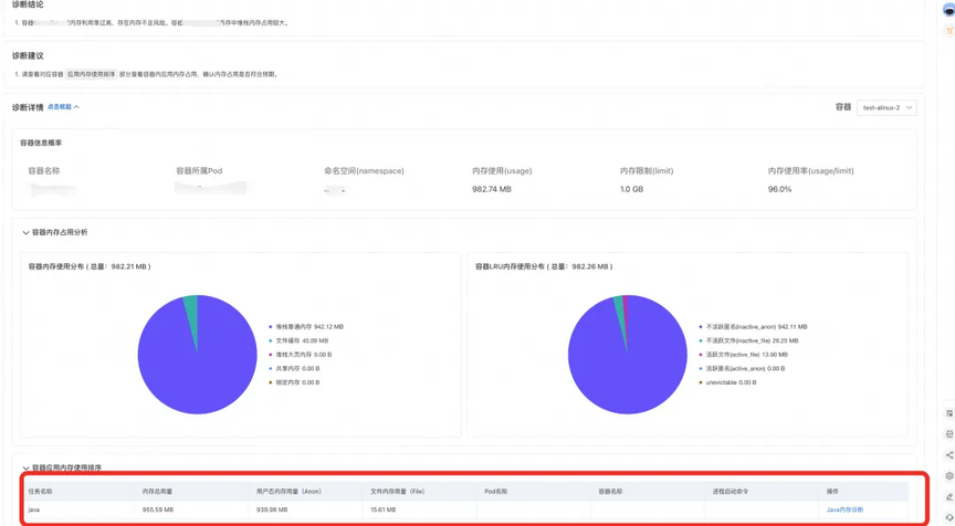 我们可以了解到当 Pod 中容器内存使用已经接近 limit,从诊断结论和容器内存占用分析中,我们可以看到容器内存主要是由于 Java 进程内存占用导致。
