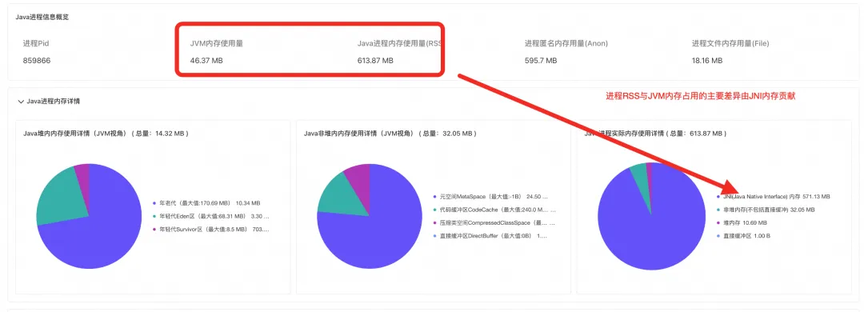 通过诊断结论和 Java 内存占用饼图我们可以发现,进程实际内存占用比 JVM 监控显示的内存占用大 570M,全都由 JNI 内存所贡献[4]。