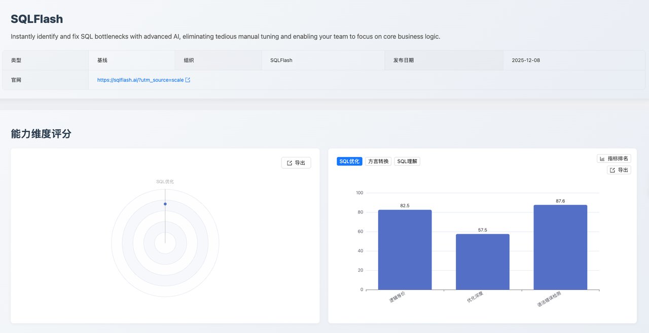 核心结论:面对全新挑战,SQLFlash 的各项指标虽有波动,但仍展现出其作为专项调优工具的专业能力。特别是 语法及最佳实践遵循 仍保持高分(87.6),确保了输出 SQL 的高可用性。