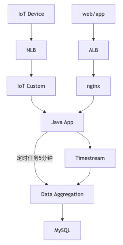 我们在保证现有的 Iot 平台整体架构逻辑设计基础上不变的情况下,重点对于数据读写 Amazon Timestream 部分进行了优化设计。如下图所示: