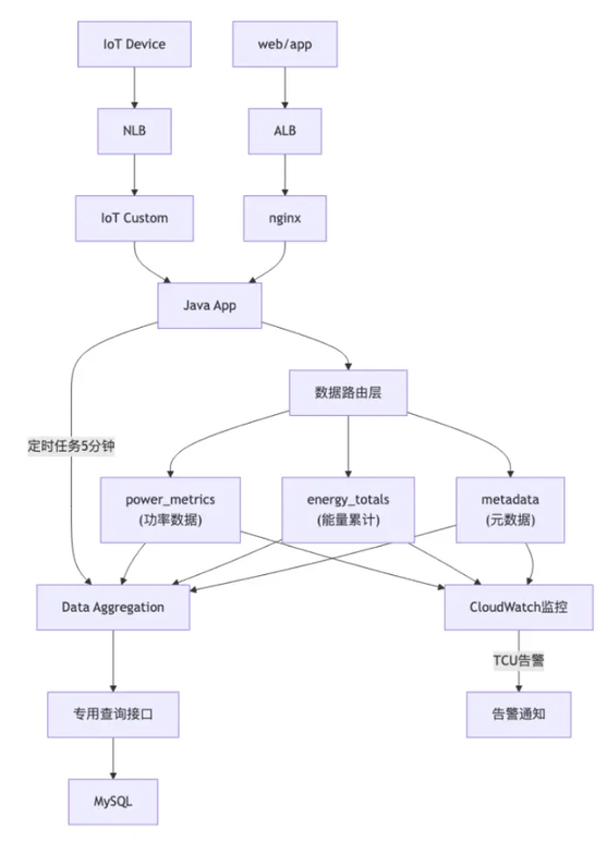我们重点关注核心数据处理流程:服务端程序通过定时任务机制,每 5 分钟执行一次数据汇聚操作。系统采用线程池并发处理方式,从 Amazon Timestream 中查询和聚合时序数据,经过计算处理后写入 MySQL 数据库进行持久化存储。详细流程如下图所示: