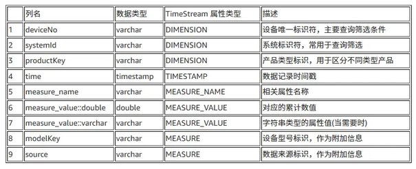 表结构(严格按此实现):| 列名 | 类型 | TimeStream属性类型 | 说明 ||------|------|-------------------|------|| deviceNo | varchar | DIMENSION | 设备编号|| systemId | varchar | DIMENSION | 系统ID|| productKey | varchar | DIMENSION | 产品类型标识 || name | varchar | DIMENSION | 属性名称,存储设备的各种属性名称 || modelKey | varchar | DIMENSION | 设备型号标识 || source | varchar | DIMENSION | 数据来源渠道 || time | timestamp | TIMESTAMP | 时间戳,记录数据产生的时间点 || value | double | MULTI | 数值型属性值,存储功率、电量等数值(必须>0) || stringValue | varchar | MULTI | 字符串属性值,存储字符串型的属性值 || checkFailedMsg | varchar | MULTI | 检查失败消息,记录数据校验失败时的错误信息 || requestId | varchar | MULTI | 请求ID,记录API请求的唯一标识符 || measure_name | varchar | MEASURE_NAME | 度量名称,固定值"metrics" |