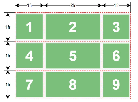 fr为 fraction(比例、分数) 的缩写。fr的个数表示网格布局的行数或列数,fr前面的数值大小,表示该行或列的尺寸占比。